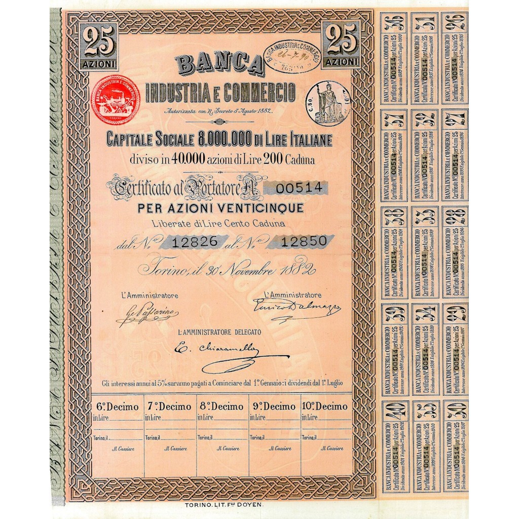 La storica banca costitutita il 30 Novembre 1882 per iniziativa di 77 industriali e commercianti per lo più milanesi, ha avuto un ruolo importante per lo sviluppo economico italiano. Questo titolo è stato emesso a Torino il 30 Novembre 1882 per 25 azioni da Lire 100