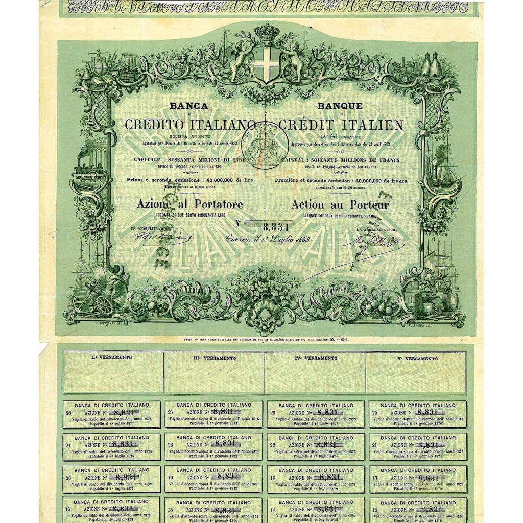 Splendido titolo storico da una Azione al Portatore di 250 Lire. Emessa a Torino il 1 Luglio 1863. La banca è stata fondata ail 24 aprile 1863 dalla Società de Credit Industriel et Commercial, con la partecipazione di alcuni grossi banchieri torinesi. Il capitale nominale di 60 milioni di lire, fu versato solo per un quinto, cosicchè l'ambizioso programma di favorire lo sviluppo econominco del Paese attraverso ogni tipo di iniziativa finanziaria dovette essere ridimensionato. Tra il 1872 e il 1875, la società venne trasferita prima a Firenze e in seguito nel capoluogo lombardo, mentre nel 1877 la Direzione dell'Istituto  comunicava all'Ufficio Provinciale di Ispezione della Società Commerciali e degli Istituti di Credito che la banca non deteneva depositi a risparmio e non aveva agenzie.