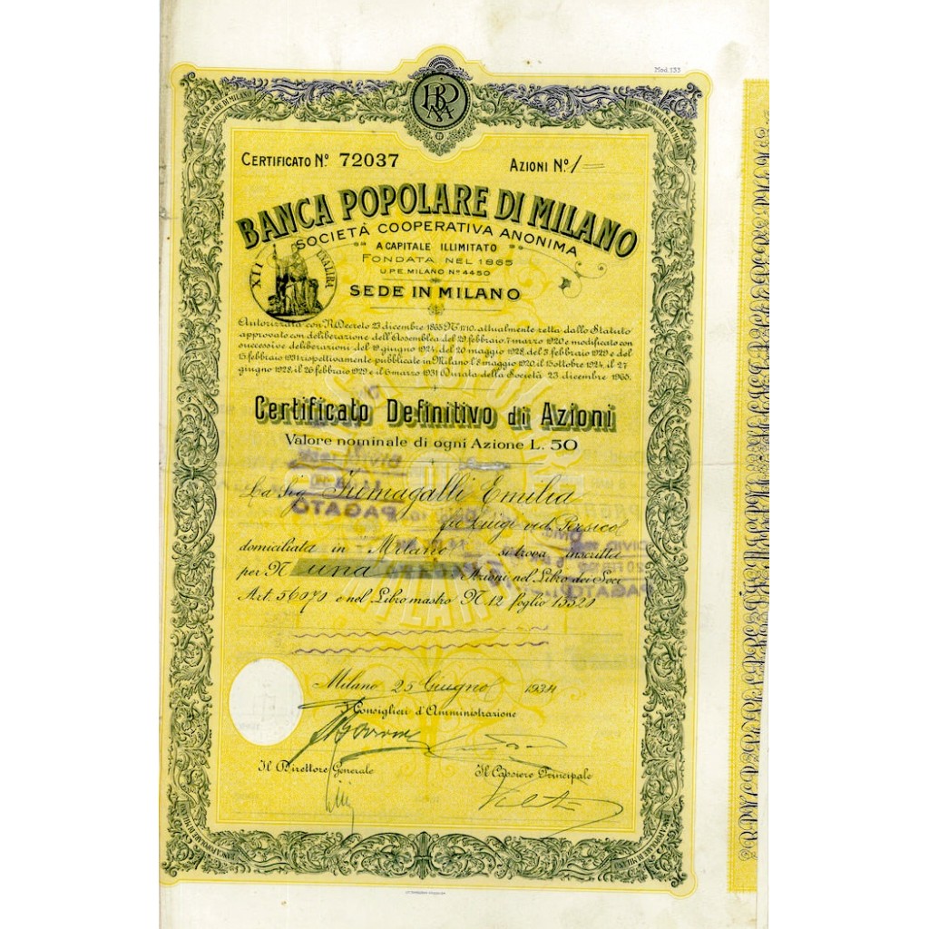 Titolo storico di 1 azione da Lire 50 cadauna della  Banca Popolare di Milano. Raro titolo storico di grande valore collezionistico. Splendida  bordatura floreale. La Banca Popolare di Milano nacque con l'intento di creare una cooperativa di credito capace di assicurare ai propri soci una sostenibilità e una competitività di fronte alla crescente forza dell'alta borghesia nella crescita industriale che caratterizzava la fine dell'Ottocento nel capoluogo lombardo.