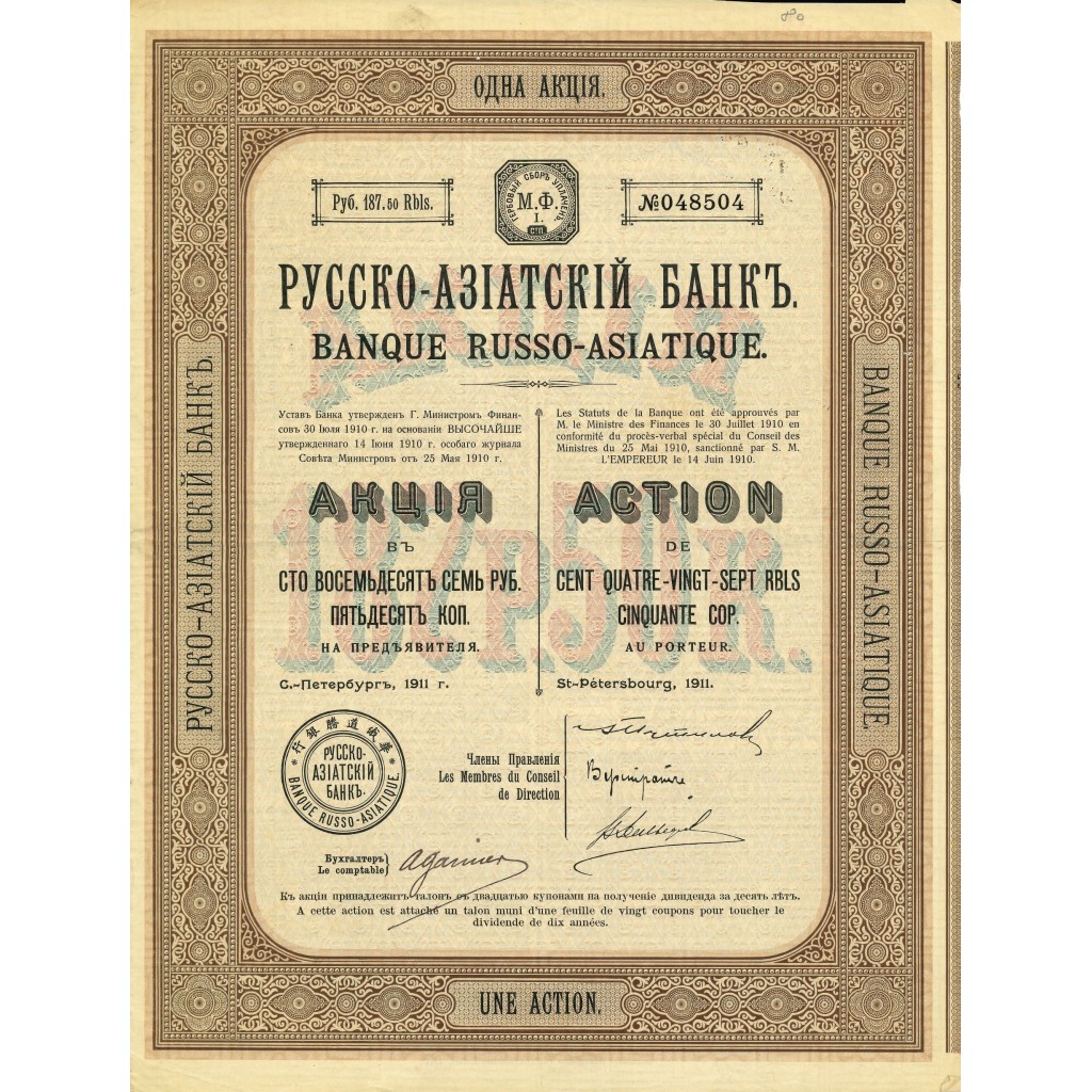 La "Banque Russo-Asiatique" è stata fondata nel 1910 a San Pietroburgo, in Russia. Questa banca ha svolto un ruolo cruciale nel facilitare le transazioni commerciali tra la Russia e i paesi asiatici, contribuendo notevolmente allo sviluppo economico dell'epoca. La banca ha emesso azioni per raccogliere capitali e finanziare le sue operazioni, tra cui l'azione storica del 1911 qui presentata.