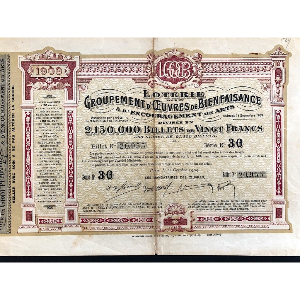 1909 - LOTERIE GROUPEMENT D'OEUVRES DE BIENFAISANCE 20 FRANCS - PARIGI - SERIE 30 N. 20955