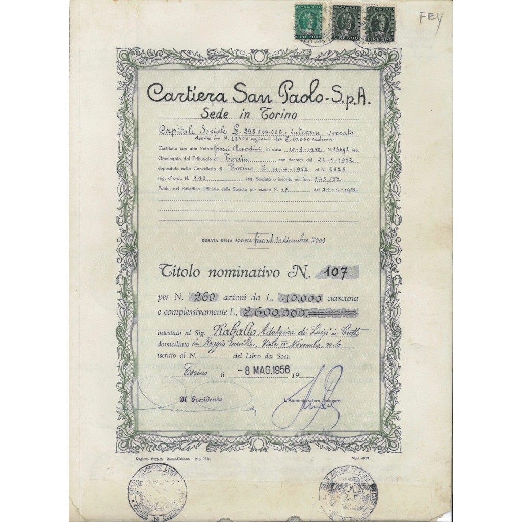 La Cartiera San Paolo S.p.A., con sede a Torino, venne costituita nel secondo dopoguerra, in un’Italia in piena ricostruzione economica. Il capitale sociale dichiarato sul titolo è di 225.000.000 di Lire, interamente versato, suddiviso in 11.250 azioni da 10.000 Lire ciascuna. Il titolo testimonia una delle tante società industriali sorte o consolidate durante il boom economico italiano (1950–1963), un periodo noto come il “Miracolo Economico Italiano”.
