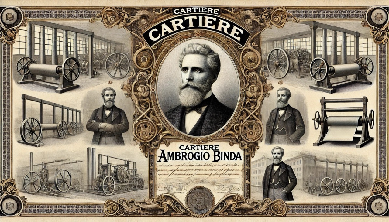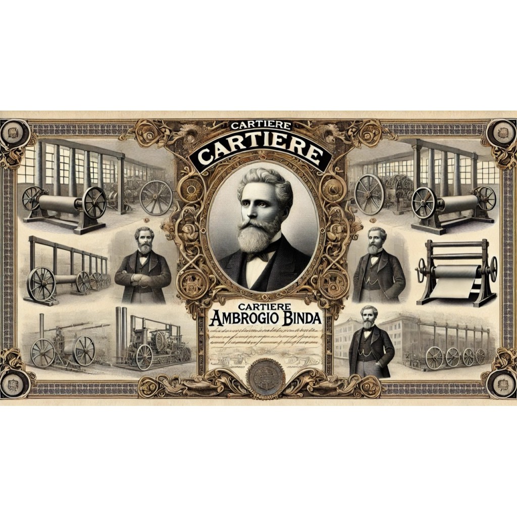 Ecco l'immagine storica rappresentativa della Cartiere Ambrogio Binda. L'illustrazione include un ritratto centrale di Ambrogio Binda circondato da bordi decorativi intricati, scene della produzione di carta con macchinari d'epoca e pile di carta, riflettendo l'importanza storica e industriale dell'azienda.