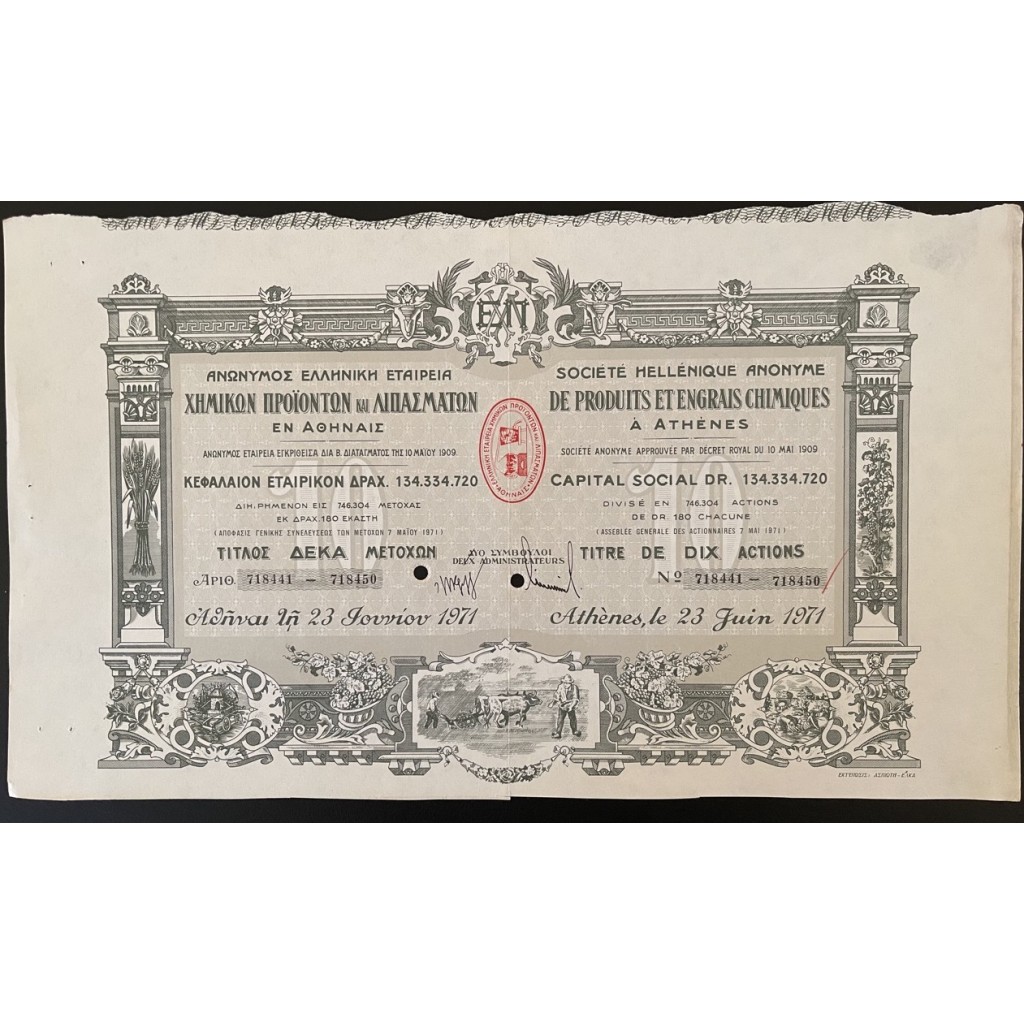 1971 - SOC. HELLENIQUE ANONYME DE PRODUITS ET ENGRAIS CHIMIQUES A ATHENES 10 ACTIONS