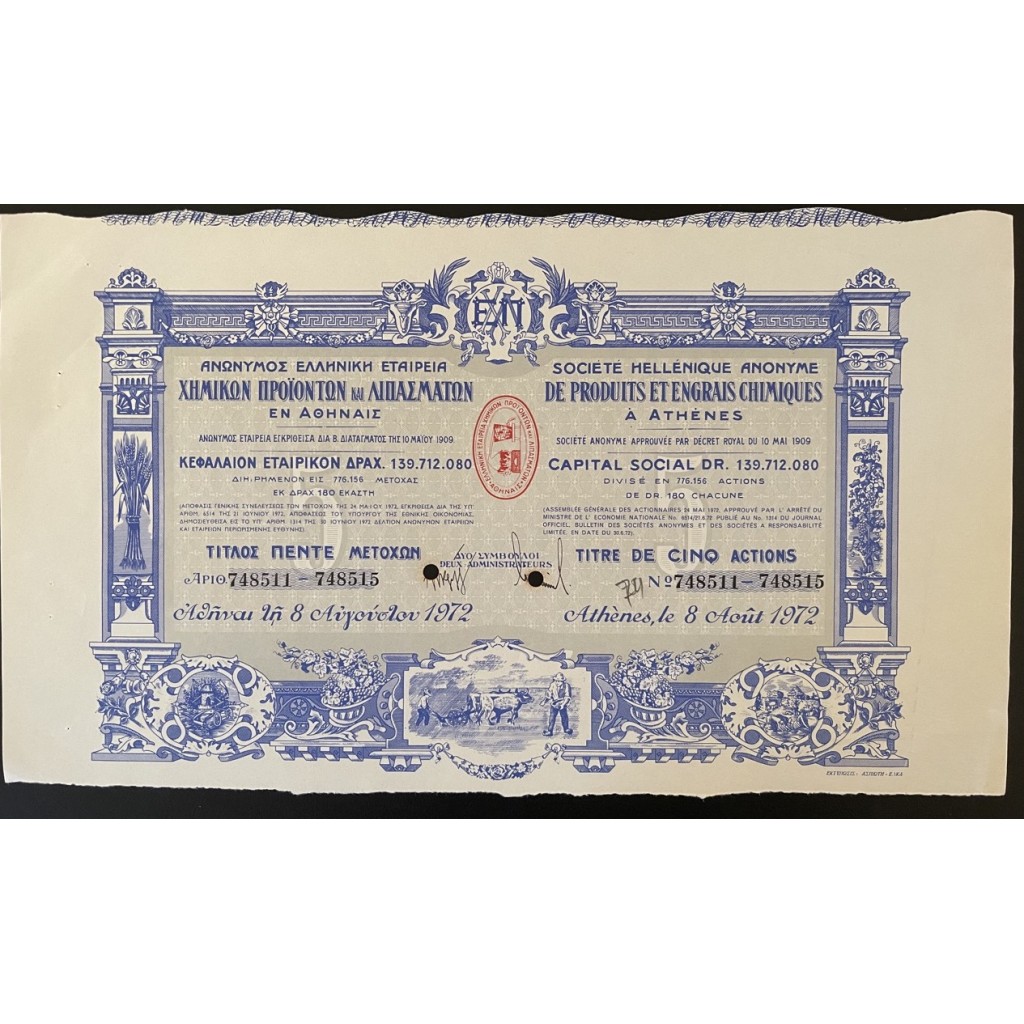 1972 - SOC. HELLENIQUE ANONYME DE PRODUITS ET ENGRAIS CHIMIQUES A ATHENES 5 ACTIONS