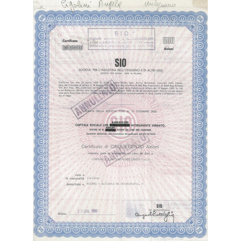 Certificato di cinquecento azioni.