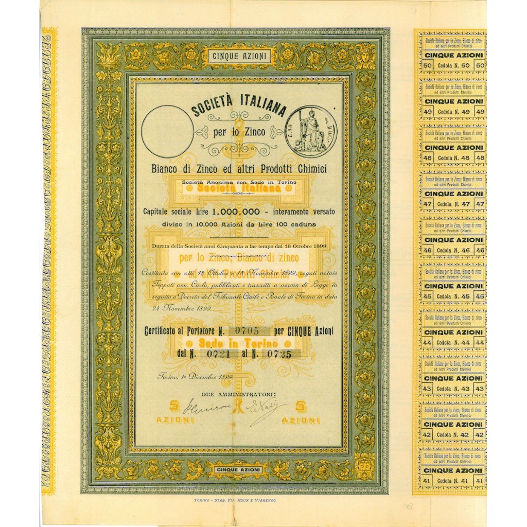 Certificato al portatore per 5 azioni del valore di Lire 100 cadauna.
