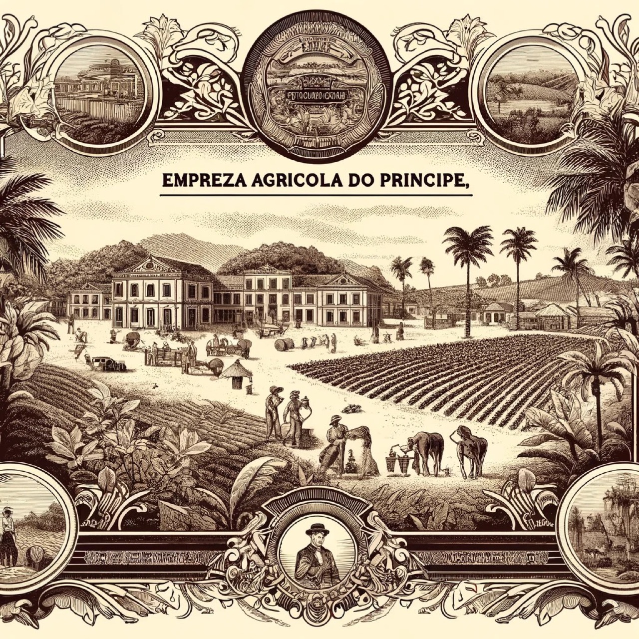 Immagine che rappresenta la storia della Empreza Agricola do Principe, ispirata alle caratteristiche visive del documento storico. L'immagine include paesaggi agricoli con piante tropicali, edifici coloniali portoghesi e scene di lavoratori impegnati nelle attività agricole. Gli elementi decorativi e i sigilli ufficiali sono stati incorporati per riflettere lo stile dei certificati azionari dell'epoca.