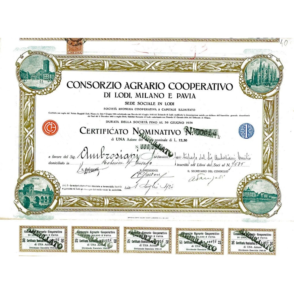 Certificato nominativo di una azione del valore di Lire 12,50.