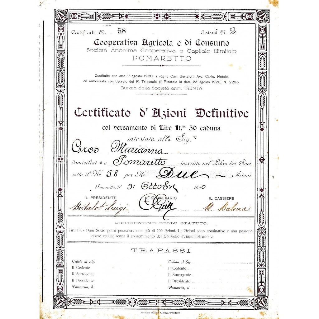 Certificato d'azioni definitive del valore di Lire 50 cadauna.