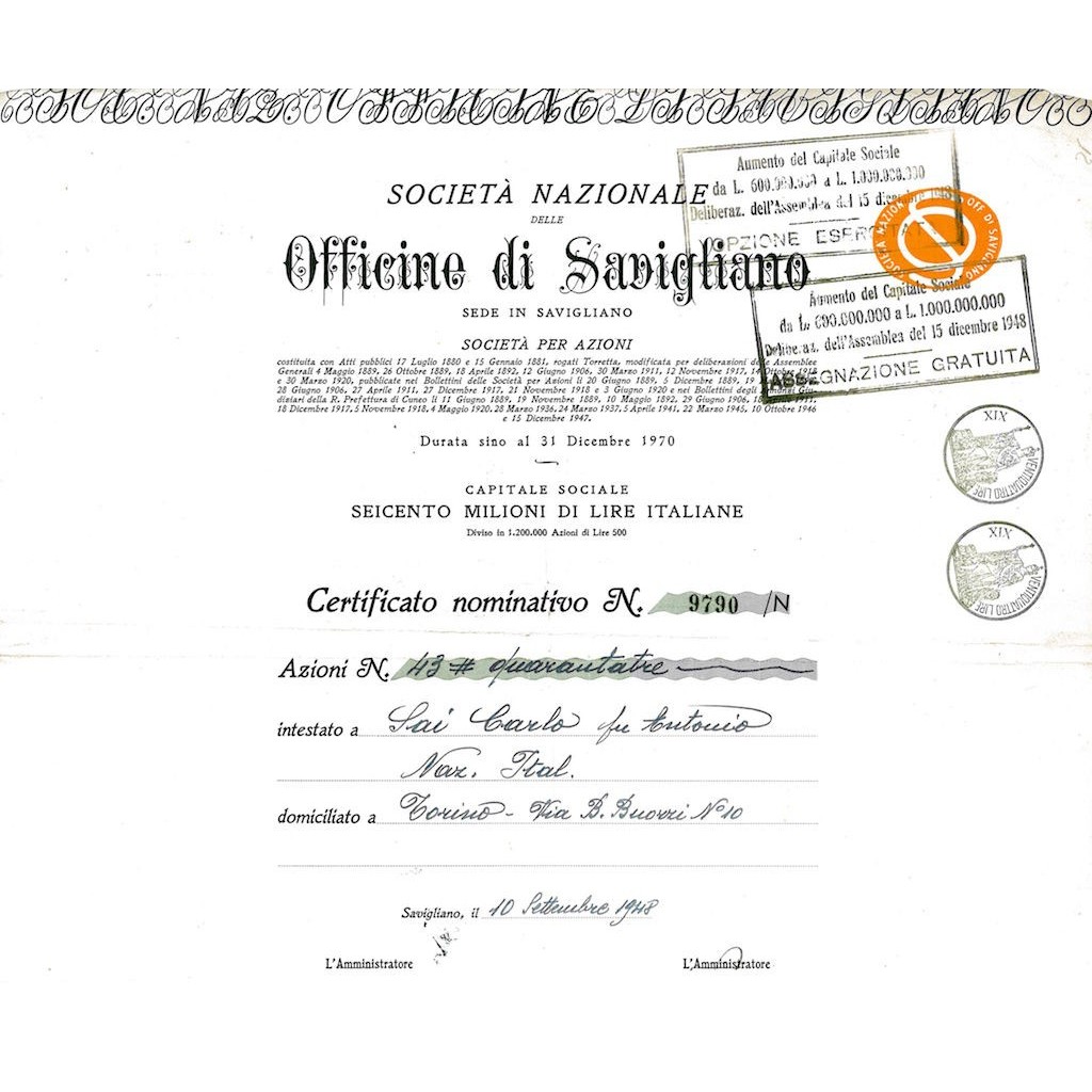 Certificato azionario nominativo.