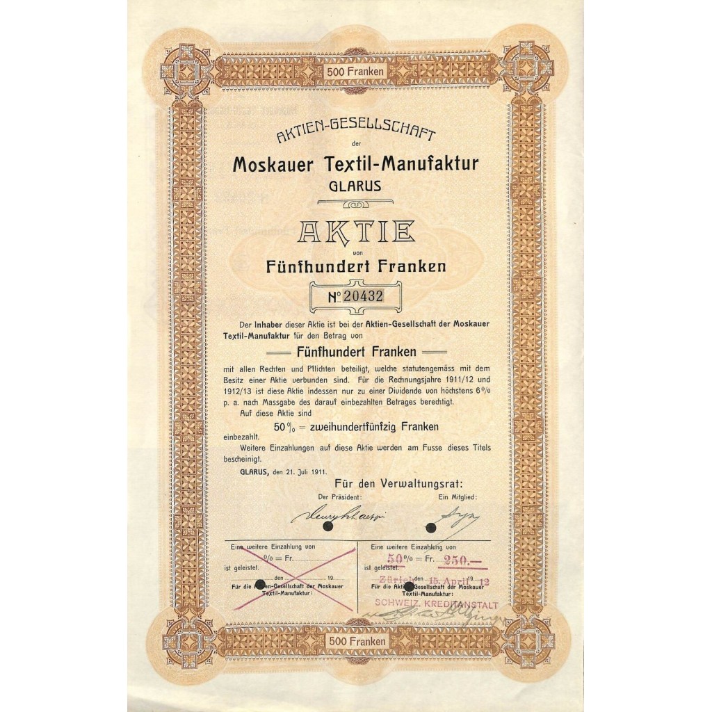 The company was founded to leverage the textile expertise of the region and to serve international markets, including Moscow, as suggested by its name. Shares like this one were issued to raise the necessary capital to finance company operations, expand production, and improve weaving technologies.