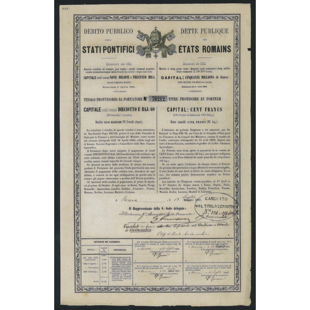 Oltre ai classici metodi di finanziamento dello stato, come le imposte o le rendite dei monopoli (come quello del sale), esisteva già dal Quattrocento una forma di debito pubblico che consisteva nella vendita delle cariche: i titolari di queste cariche venali, spesso solo onorifiche, venivano poi rimunerati o con le entrate dai rispettivi servizi o dalle entrate generali. Ma dopo la tempesta luterana e lo scisma anglicano si dovette ricorrere a nuove forme di finanziamento. Anche se forme di debito pubblico esistevano a Venezia, Genova e Firenze già dal XII secolo, fu Clemente VII Medici il primo a fare uso sistematico di questo nuovo strumento: nel 1526 fu emesso il Monte della Fede i cui introiti servirono a sostenere Carlo V nella guerra contro i Turchi. Nel 1670 il segretario Arrighi fu accusato di aver incassato ingiustamente il prezzo di luoghi non vincolati (più cari) facendoli passare per vincolati. Come conseguenza Clemente X convocò una Congregazione speciale incaricata di raccomandare una riforma dell'ufficio. Nel 1671 Clemente decise di abolire la venalità dell'incarico e di riorganizzare le Segreterie sotto un unico segretario. La scelta cadde su Diego Ursaja, clericus polycastrensis, fino allora segretario di tre monti. Il prezzo dell'appalto vita natural durante era di 5500 scudi l'anno: in sostanza un ufficio venale sotto altro nome. Ma Ursaja non riuscÌ a far quadrare i conti e le sue richieste per una riduzione del prezzo dell'appalto non furono accolte. Nel 1688 Ursaja abbandonò l'ufficio e fece perdere le sue tracce. Nello stesso anno Innocenzo XI riformò di nuovo l'ufficio creando quattro Segreterie. Nei decenni successivi l'organizzazione delle Segreterie fu oggetto di costante dibattito e frequenti cambiamenti di rotta: nel 1701 Clemente XI abolì la venalità della carica e affidò l'ufficio ad un solo Amministratore generale. In aggiunta decise di concentrare gli uffici, che prima si trovavano nelle abitazioni dei segretari, in una sola località, vicino al nuovo Palazzo di Montecitorio, di recente completato e sede della Curia Pontificia. In questo modo si rendeva possibile un miglior controllo dell'attività del personale. Dopo diverse altre riforme, nel 1743 Benedetto XIV incorporò la Depositeria nel Monte di Pietà di Roma completando così il processo di burocratizzazione dell'amministrazione dei monti. Introduzione Le obbligazioni presentate risalgono al 1860, emesse dagli Stati Pontifici sotto il papato di Papa Pio IX. Questi documenti rappresentano un'importante testimonianza storica del debito pubblico accumulato dagli Stati della Chiesa durante un periodo cruciale della storia italiana e vaticana. Le obbligazioni erano emesse in più lingue (italiano, francese, tedesco e inglese), riflettendo la natura internazionale dei mercati finanziari dell'epoca. Dettagli del Documento Le obbligazioni presentano diverse informazioni cruciali, tra cui: Emissione: 1860. Capitale: 50 milioni di franchi (nove milioni trecento mila scudi romani). Rendita annuale: 5% (4,65% in alcune varianti). Lingue: Italiano, Francese, Tedesco, Inglese. Struttura del Documento Intestazione: Gli Stati Pontifici, con i simboli papali (le chiavi incrociate e la tiara papale). Descrizione del Capitale: Specifiche sul capitale emesso e sulle rendite annuali in diverse valute e sistemi di misura. Dettagli di Pagamento: Informazioni sulle scadenze e sulle modalità di pagamento degli interessi, compresi i dettagli per il pagamento in diverse città europee (Roma, Napoli, Parigi, Bruxelles, Amsterdam, Londra, Dublino, Francoforte, Vienna, Monaco, Berlino, Lucerna, Madrid, Lisbona). Autorizzazione e Firma: La creazione e vendita delle rendite è stata autorizzata da Sua Santità Papa Pio IX, con firme autenticate e timbri ufficiali. Contesto Storico L'emissione di queste obbligazioni avvenne in un periodo di significativi cambiamenti per gli Stati Pontifici e per l'Italia. Nel 1860, l'Italia era nel pieno del Risorgimento, il movimento per l'unificazione italiana. Gli Stati Pontifici, governati dal Papa, erano tra gli ultimi ostacoli all'unificazione totale dell'Italia sotto il Regno di Vittorio Emanuele II. Papa Pio IX, che governò dal 1846 al 1878, dovette affrontare numerose sfide politiche e sociali, inclusa la perdita di potere temporale con la presa di Roma nel 1870.