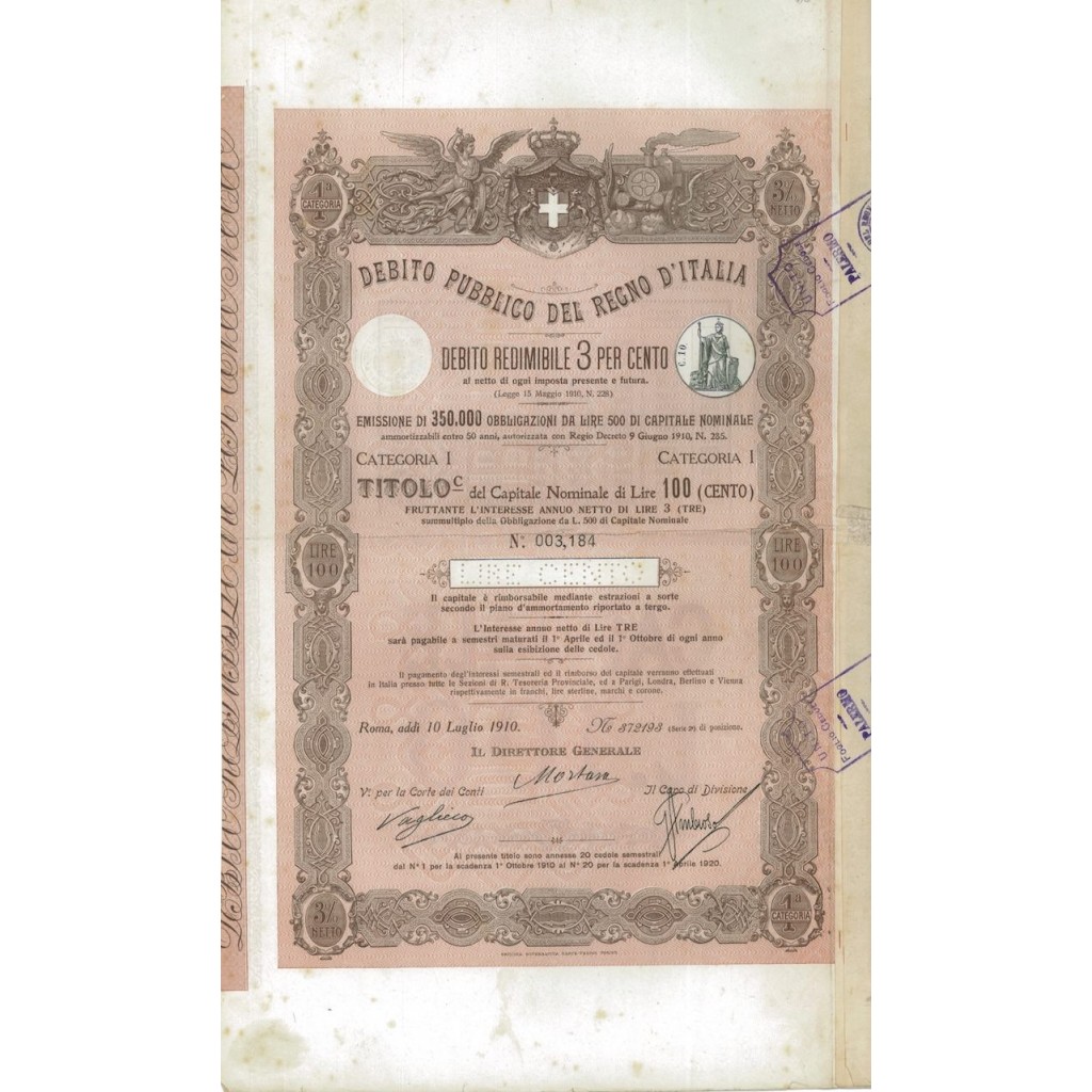 Introduzione Il documento che stiamo esaminando è un Titolo di Debito Pubblico Redimibile al 3%, emesso dal Regno d'Italia il 10 luglio 1910. Questo certificato rappresenta un'importante testimonianza delle strategie finanziarie adottate dal governo italiano all'inizio del XX secolo per finanziare le proprie attività e sostenere la crescita economica del Paese.