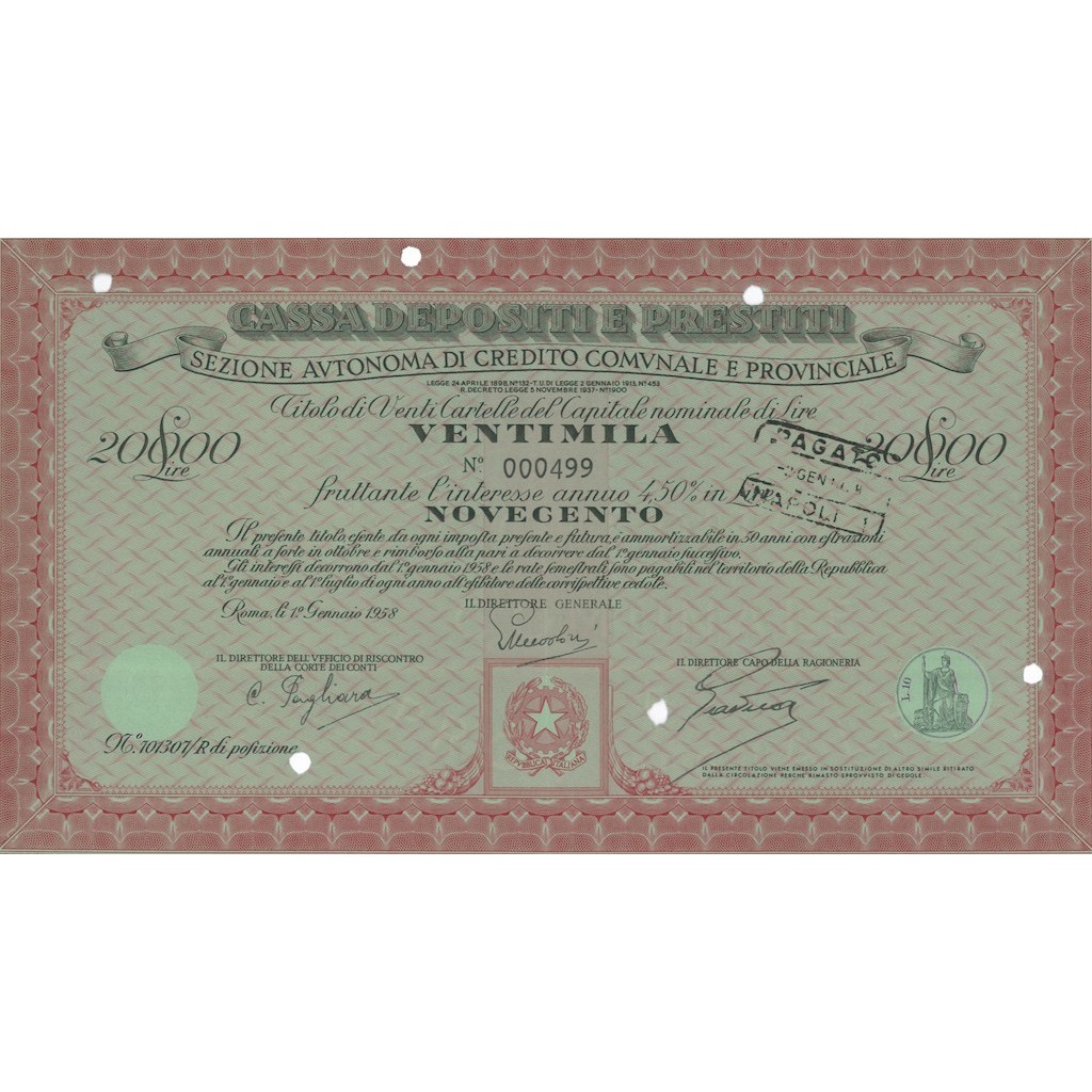 CASSA DEPOSITI E PRESTITI 20 CARTELLE DA 20.000 LIRE 4,50% ROMA 1958