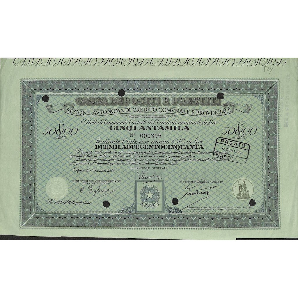 CASSA DEPOSITI E PRESTITI TITOLO DI 50 CARTELLE 4,50% ROMA 1958