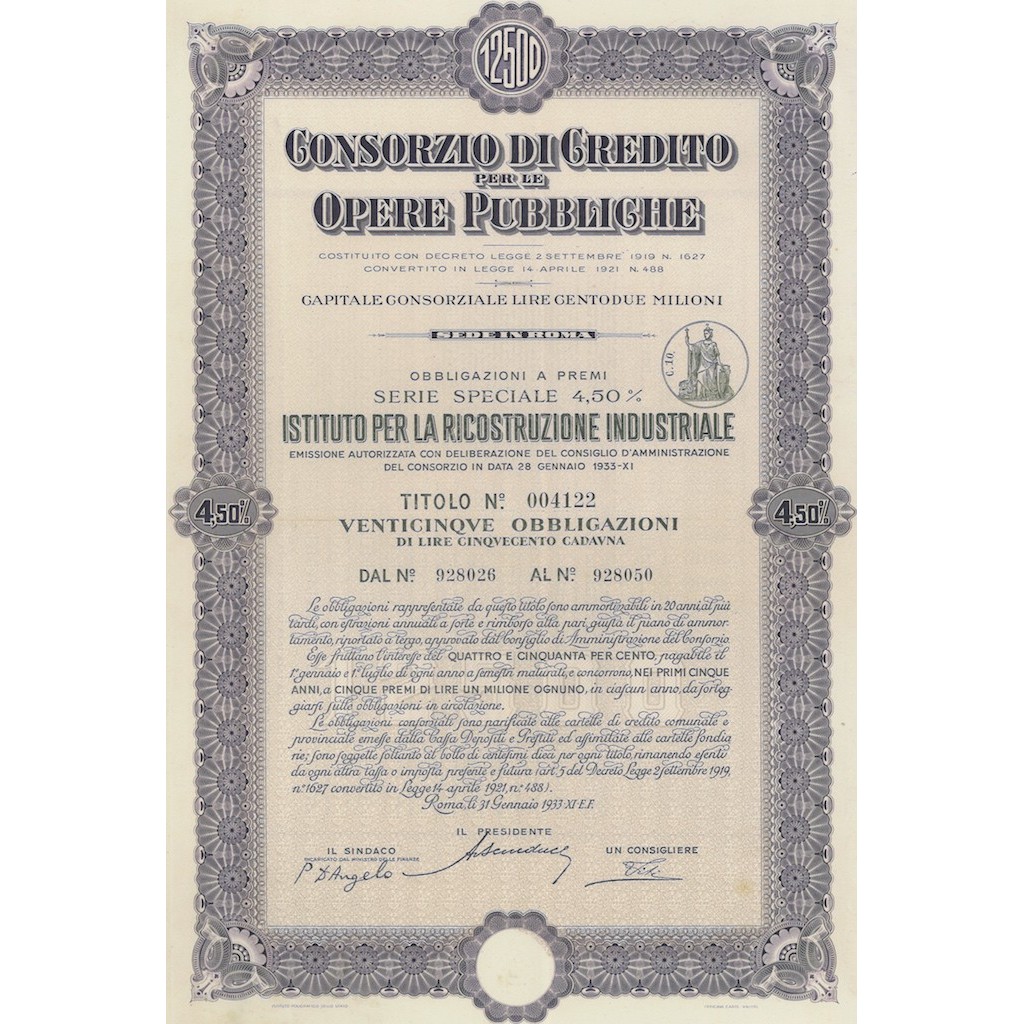CONS. DI CREDITO PER LE OPERE PUBBLICHE IST. RICOSTRUZIONE IND. 25 OBBL. 4,50% ROMA 1933