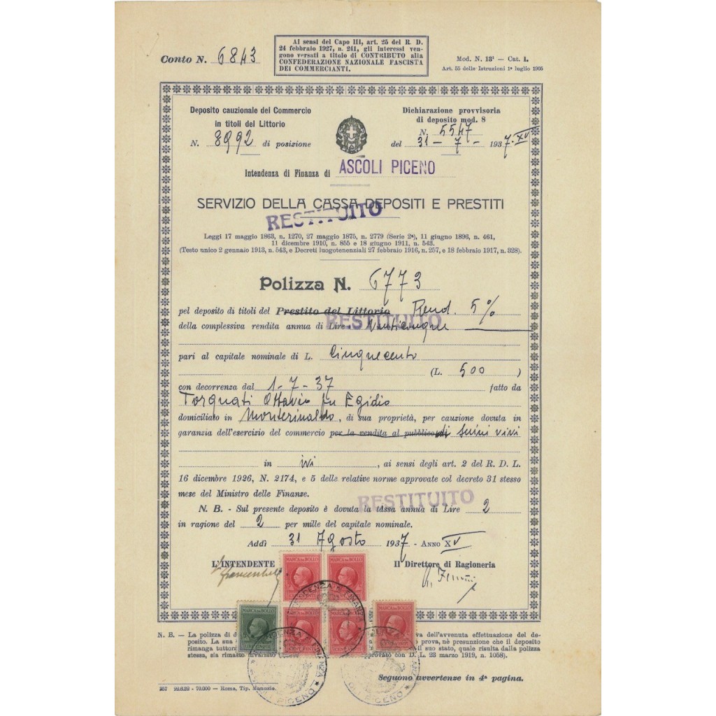 POLIZZA TITOLI DEL PRESTITO LITTORIO (MARCA DA BOLLO LIRE 3)