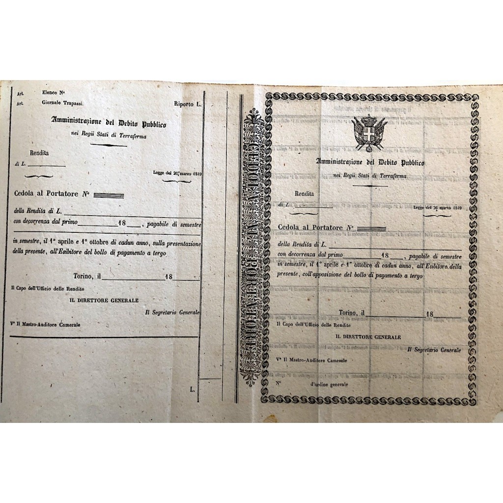 La cedola al portatore con rendita del 1849, emessa dall'Amministrazione del Debito Pubblico nei Regi Stati di Terraferma, rappresenta un significativo pezzo della storia economica del Regno di Sardegna. Questo documento era utilizzato come strumento per la gestione del debito pubblico, consentendo allo Stato di raccogliere fondi attraverso l'emissione di titoli che garantivano una rendita agli investitori.
