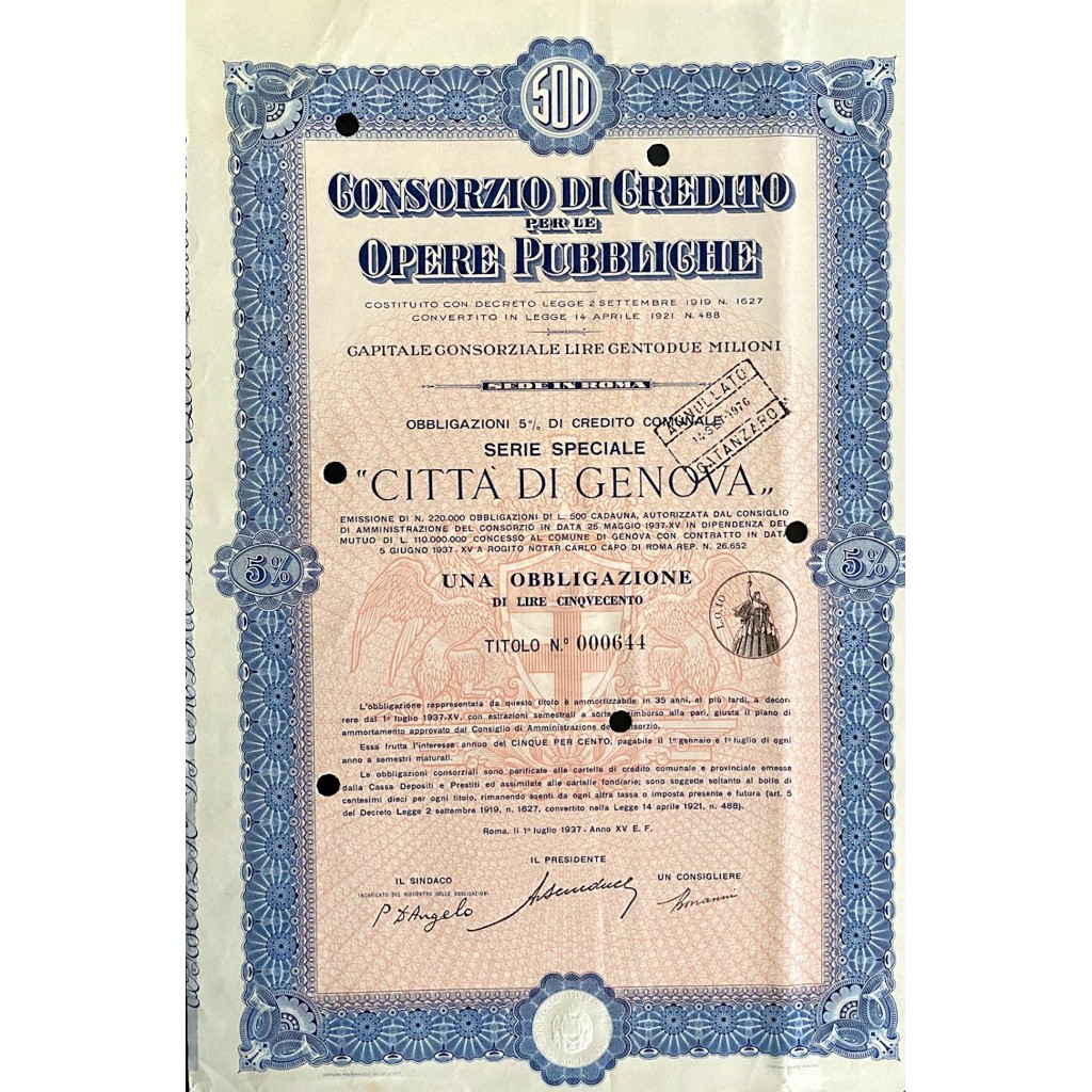 Importante titolo della Città di Genova. Questa obbligazione emessa nel 1937 dava il 5% di Credito comunale. Emissione di n. 220.000 obbligazioni di Lire 500 cadauna. Grafica centrale con stemma della città di Genova su carta filigranata con le scritte d'epoca. Riporta le firme del presidente, del sindaco e di un consigliere.