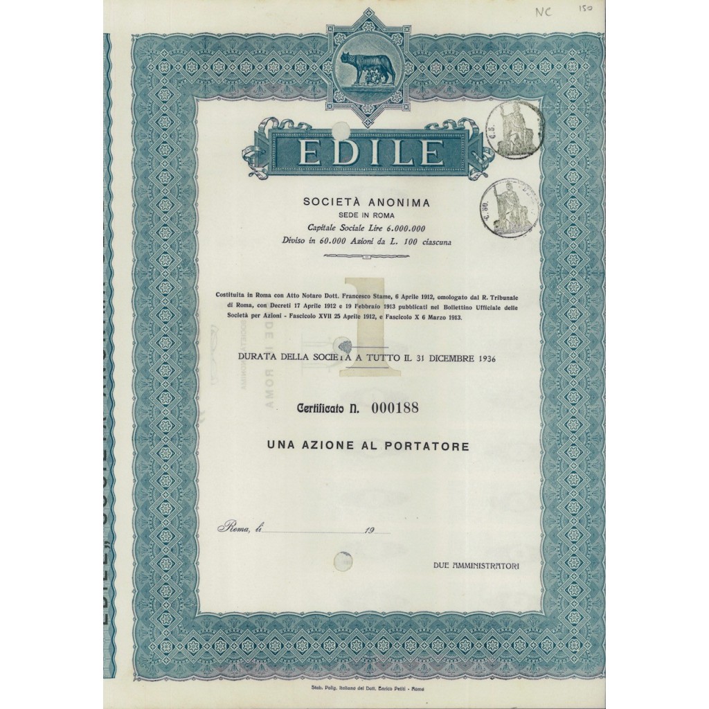 La Edile S.A. nasce a Roma nel 1912, in un periodo di intenso sviluppo urbanistico della capitale post-unitaria. La scelta del nome “Edile” richiama direttamente l’attività edilizia, centrale nella modernizzazione della città, e trova espressione anche nel simbolo della Lupa Capitolina, a sottolineare l’identità romana. L’emissione di titoli al portatore da 100 lire riflette la volontà di attrarre un ampio numero di investitori in un settore allora ritenuto strategico. Questo titolo è rappresentativo del fervore imprenditoriale dell’Italia dei primi del Novecento e della fiducia nel progresso urbano come leva di crescita nazionale.