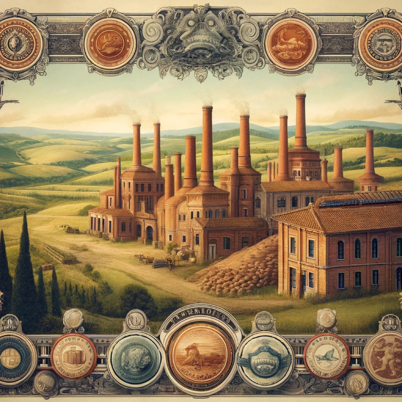 Ecco un'immagine rappresentativa della storia della società "Eredi Frazzi fu Andrea" e della fornace Frazzi di Ponticelli. L'immagine riflette una scena di una vecchia fabbrica di mattoni immersa in un paesaggio rurale italiano, ricordando le campagne dell'Umbria e della Toscana. La fabbrica è dotata di forni tradizionali per la cottura dei mattoni, circondata da cave di argilla, con elementi architettonici ispirati a dettagli storici e decorativi presenti sui certificati azionari d'epoca. L'atmosfera complessiva è nostalgica, riflettendo l'importante impatto della fornace sulla comunità locale.
