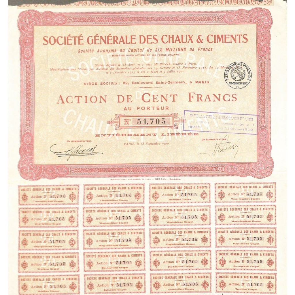 1920 - GENERALE DES CHAUX ET CIMENTS SOC. (CAP. SOC. 6.000.000 DI FR.)