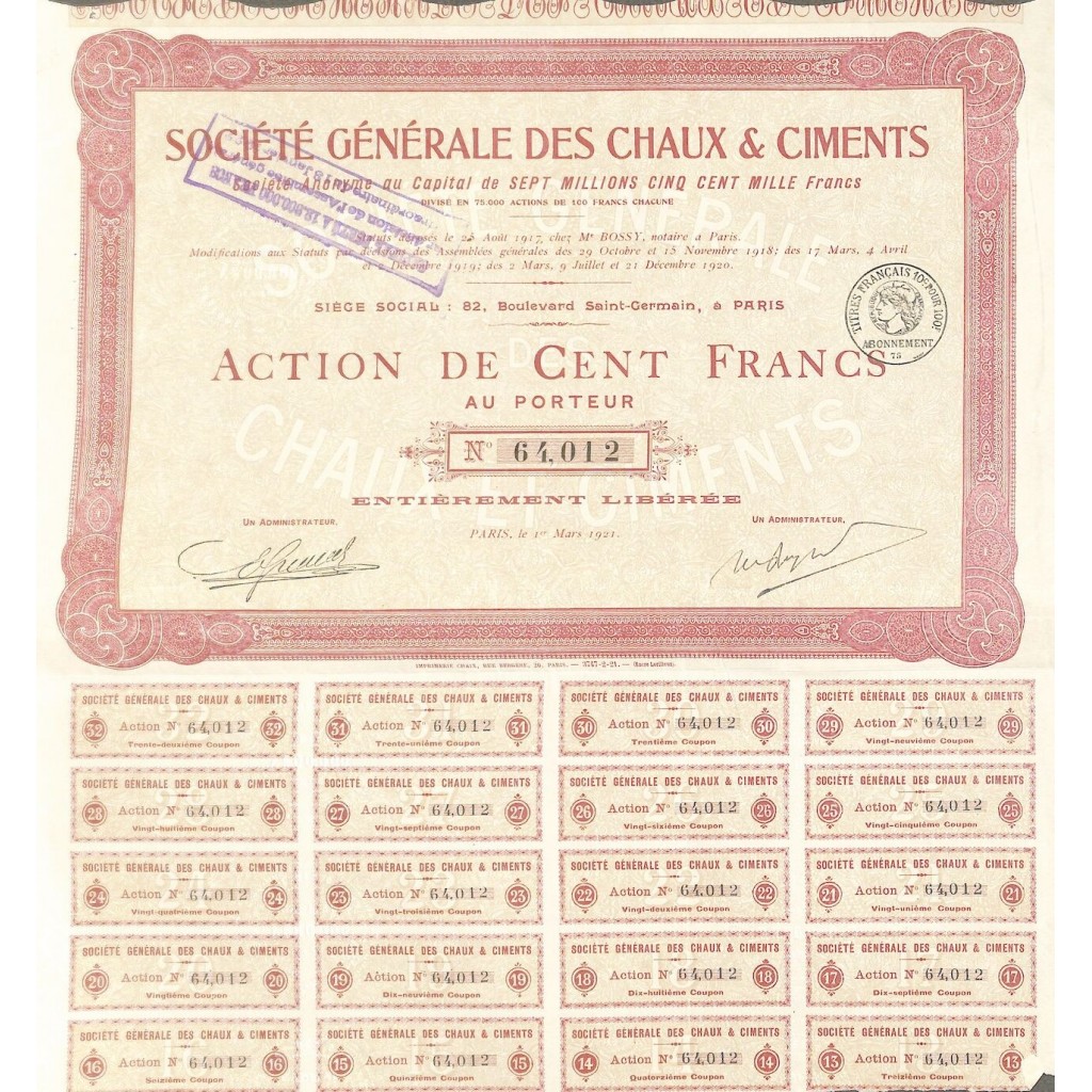 1921 - GENERALE DES CHAUX ET CIMENTS SOC. (CAP. SOC. 7.500.000 FR.)