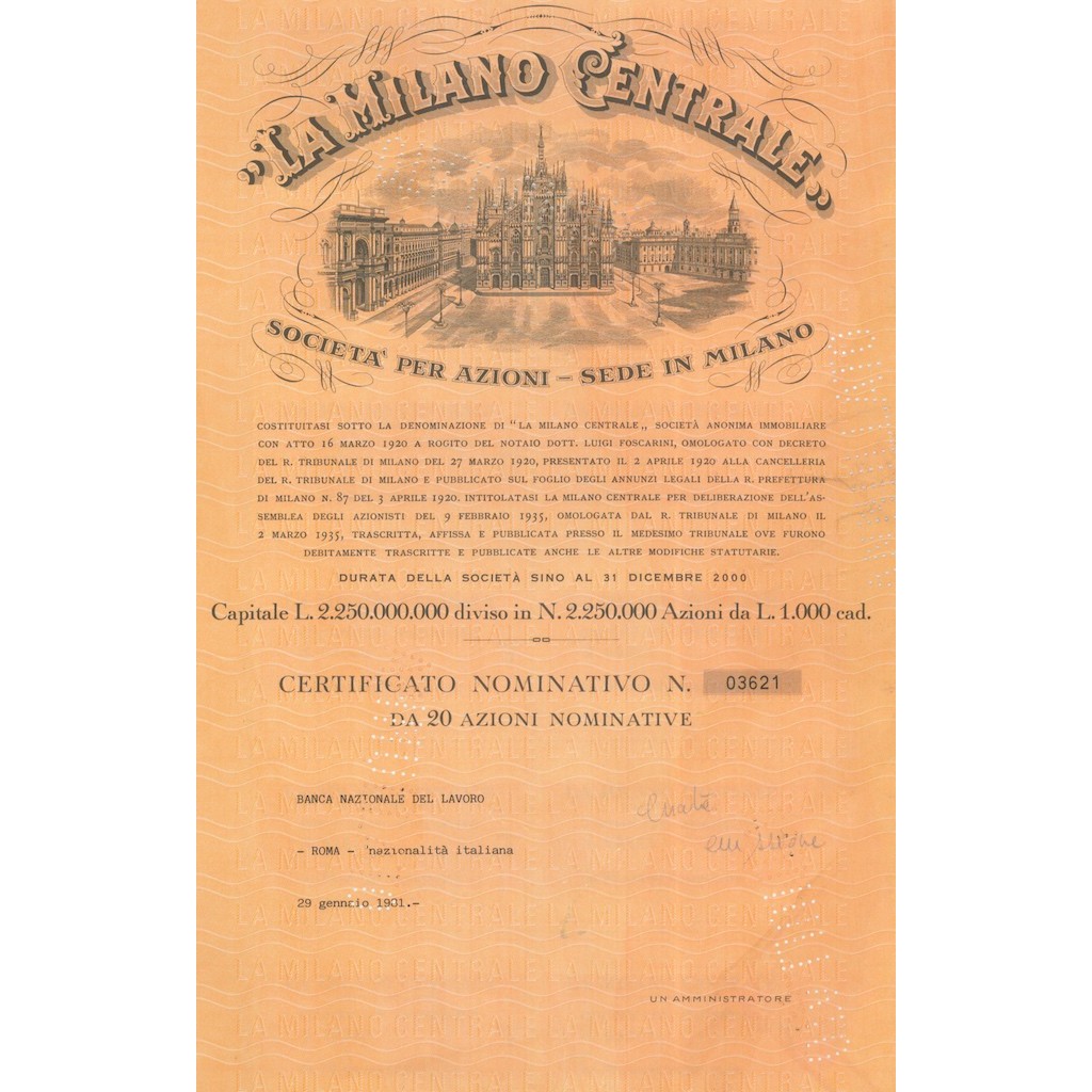 In asta un raro certificato nominativo emesso dalla "La Milano Centrale" - Società per Azioni, con sede a Milano, datato 29 gennaio 1981. Il certificato rappresenta 20 azioni nominative del valore nominale di 1.000 Lire ciascuna, intestato alla Banca Nazionale del Lavoro - Roma.