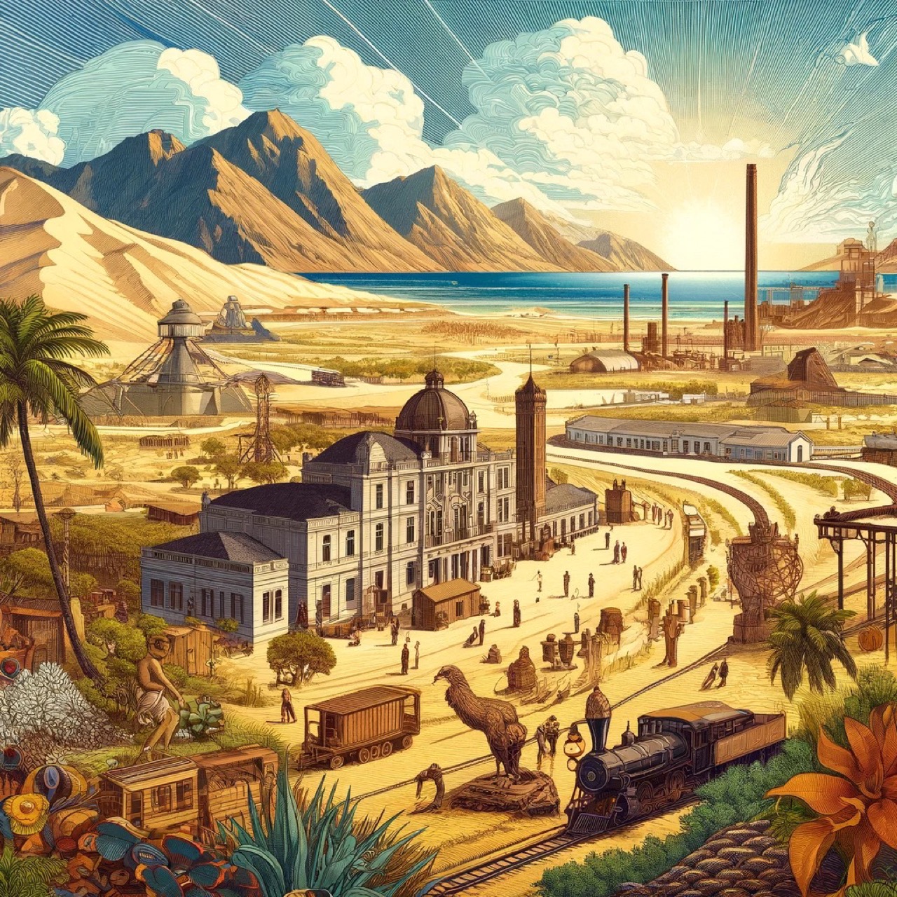 Un'immagine artistica che rappresenta la Companhia de Mossamedes negli anni '20, ispirata alla storia e al contesto della società. La scena include paesaggi africani come deserti, montagne e la costa dell'Angola, insieme a elementi di infrastrutture come ferrovie, porti e attività minerarie. Sono stati incorporati anche stili architettonici coloniali e motivi decorativi floreali e geometrici.