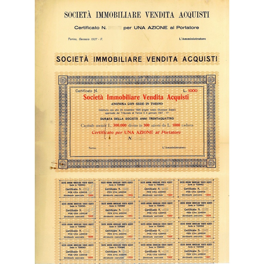 Certificato per una azione al portatore del valore di Lire 1000.