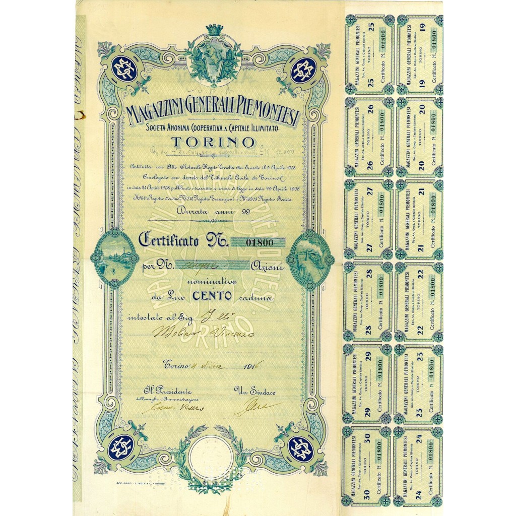 Certificato nominativo per azioni del valore di Lire 100 cadauna.