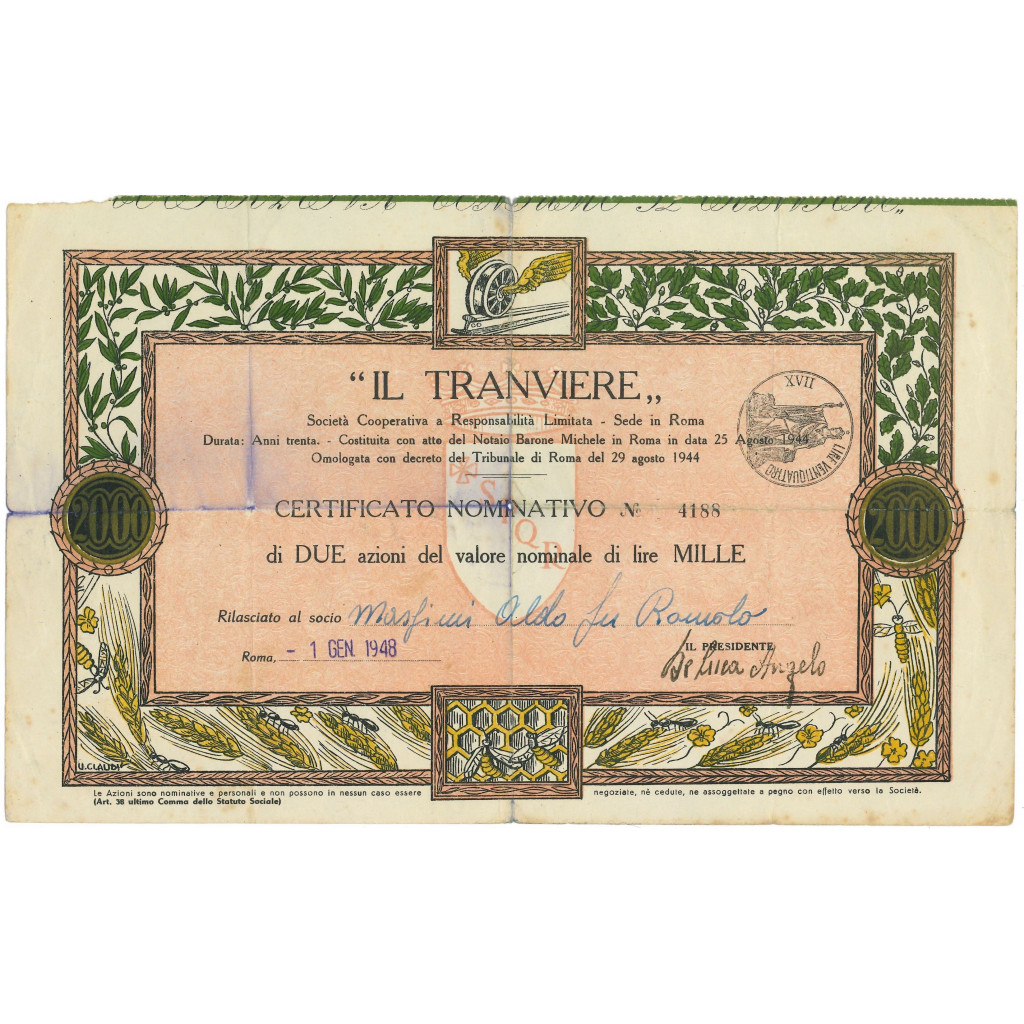 titolo storico da collezione della Società Cooperativa a Responsabilità Limitata - Sede di Roma - Costituita con atto Notaio Barone in Roma il 25 agosto 1944. N. 2 azioni del valore di lire 2.000