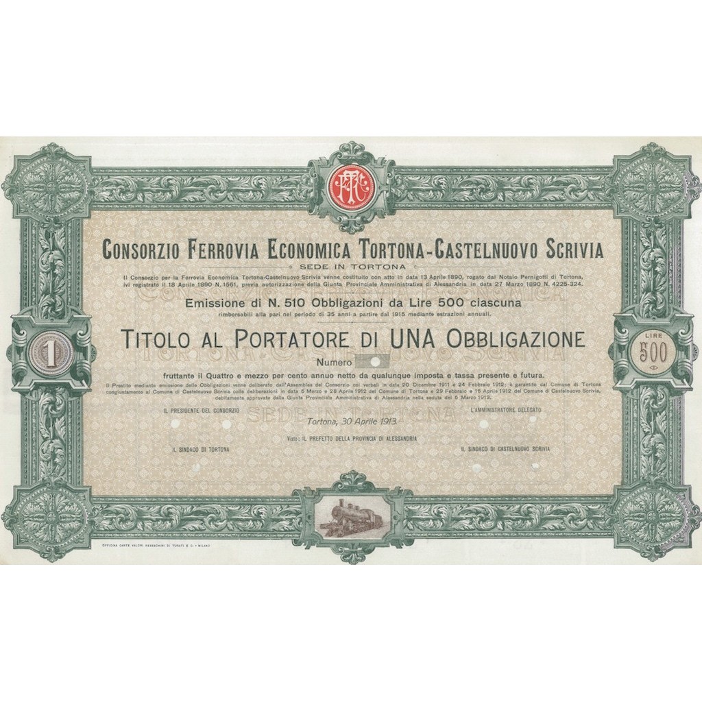 I titoli obbligazionari furono emessi il 30 aprile 1913 a Tortona e furono stampati dalle officine Carte Valori Rebeschini di Turati & C. di Milano. Questi documenti presentavano una splendida grafica, con un'immagine di un locomotore antico situata in basso al centro del titolo.