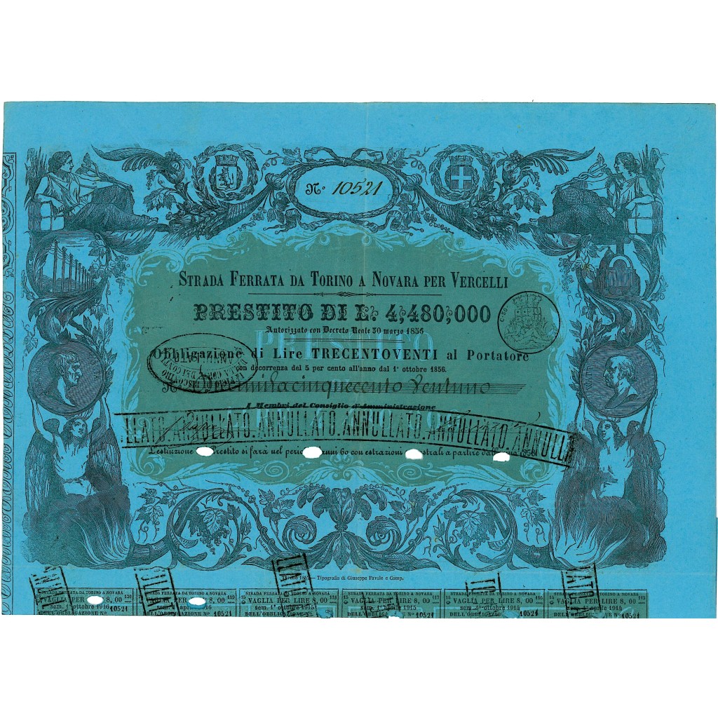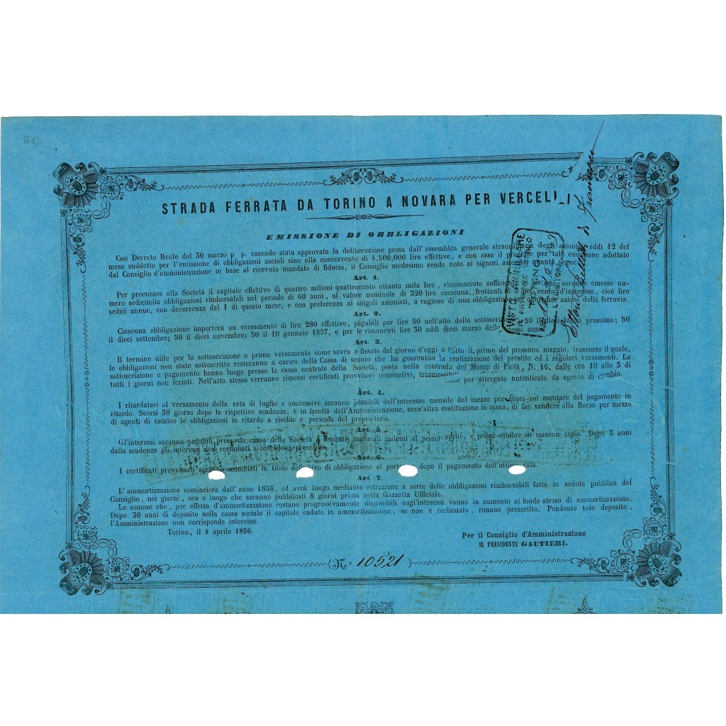 L'emissione del titolo avvenne in un periodo cruciale della storia italiana. Nel 1856, l'Italia era ancora divisa in vari stati indipendenti, e il Regno di Sardegna, sotto la guida di Cavour, stava pianificando la futura unificazione del paese. La costruzione di infrastrutture moderne come la ferrovia da Torino a Novara era fondamentale per promuovere lo sviluppo economico, facilitare i movimenti delle truppe e rafforzare l'influenza politica del Regno di Sardegna nel processo di unificazione.