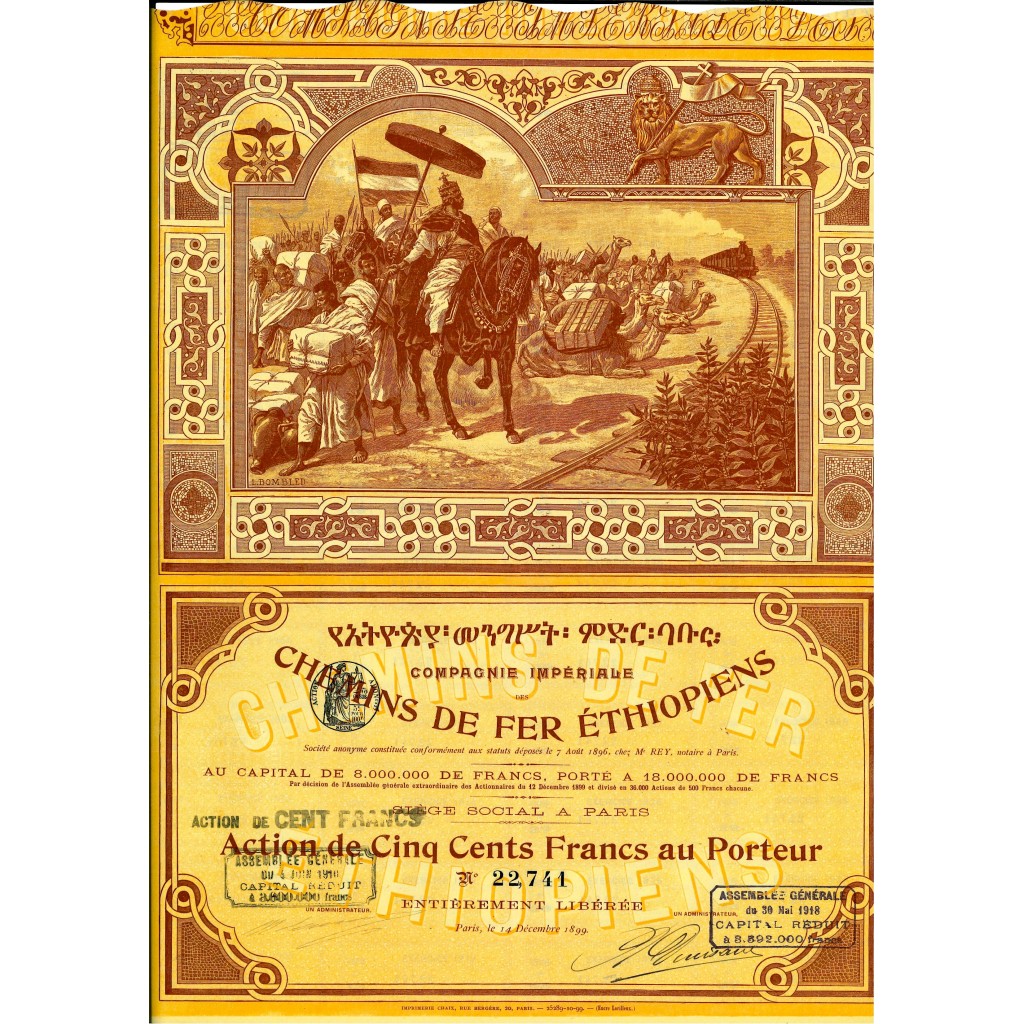 1899 - COMP. IMPERIALE CHEMINS DE FER ETHIOPIENS 1 AZIONE 100 FRANCHI - PARIGI
