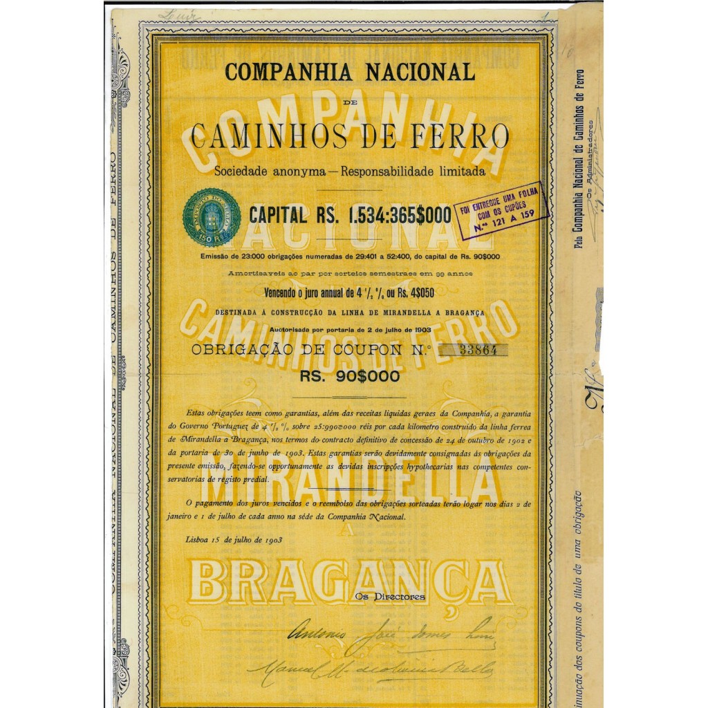 Descrizione Generale L'obbligazione in esame è stata emessa dalla "Companhia Nacional de Caminhos de Ferro", una società per azioni a responsabilità limitata con un capitale di Rs. 1,534,365,000. Questo documento rappresenta un investimento significativo nel settore ferroviario brasiliano all'inizio del XX secolo, riflettendo l'importanza delle infrastrutture di trasporto nello sviluppo economico dell'epoca.