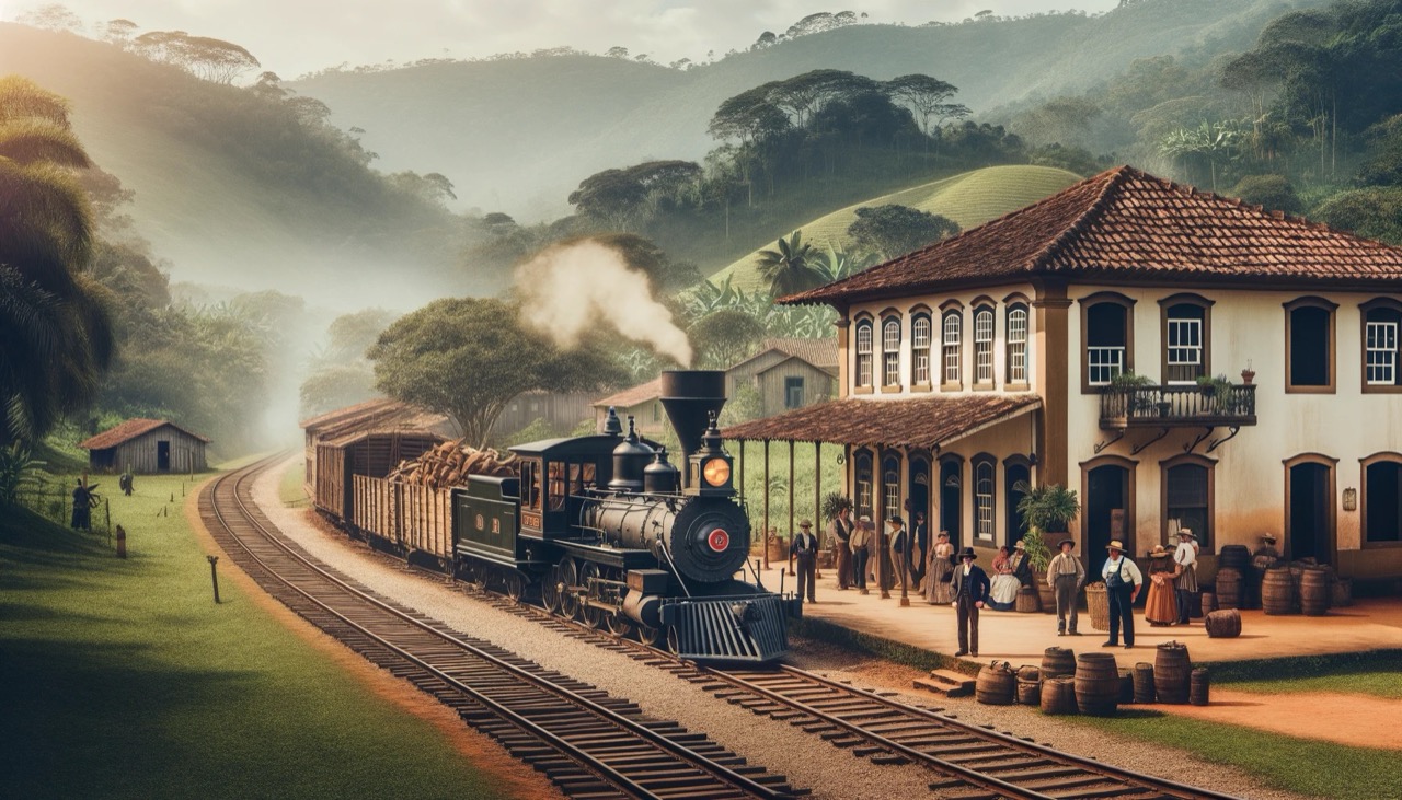 L'immagine rappresentativa della storia della Companhia Nacional de Caminhos de Ferro. La scena raffigura una locomotiva a vapore storica su una linea ferroviaria brasiliana dei primi anni del 1900, con una stazione ferroviaria in stile coloniale e operai in abiti d'epoca. L'atmosfera evoca il contesto storico, con dettagli che riflettono il periodo e l'importanza delle infrastrutture ferroviarie per lo sviluppo economico dell'epoca.