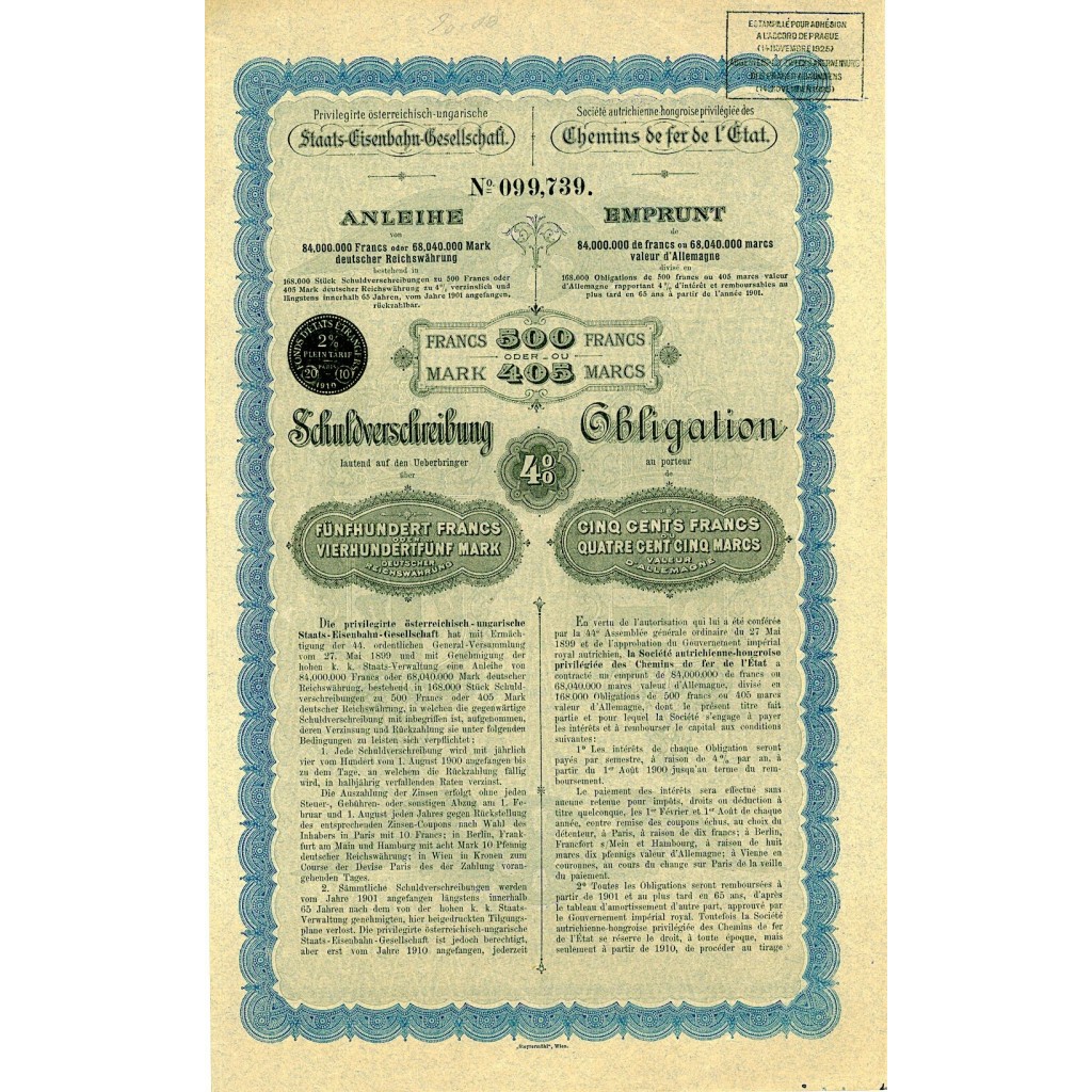 Titolo obbligazionario 4% del valore di 500 Franchi o 405 Marchi.