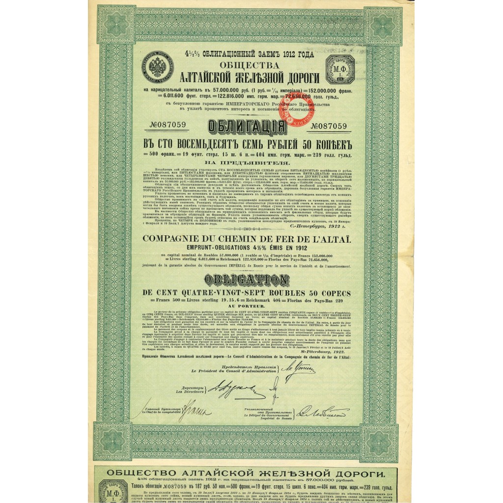 La Compagnie du Chemin de Fer de l'Altai, fondata nel 1912, è stata una delle principali società ferroviarie dell'Impero Russo. Con sede a San Pietroburgo, la compagnia aveva l'obiettivo di sviluppare una rete ferroviaria nella regione dell'Altai, una zona strategica per il commercio e il trasporto. Il capitale nominale della società era di 57.000.000 rubli, garantito dal governo imperiale russo.