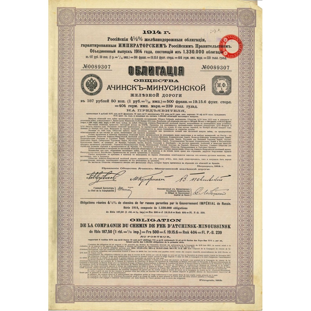 La Compagnie du Chemin de Fer d'Atchinsk-Minoussinsk, fondata nel 1914, è stata una delle principali società ferroviarie dell'Impero Russo. Con sede a San Pietroburgo, la società aveva l'obiettivo di sviluppare una rete ferroviaria strategica che collegasse Atchinsk e Minoussinsk, facilitando il commercio e il trasporto nella regione. Il capitale nominale della società era di 187,50 rubli, garantito dal governo imperiale russo.