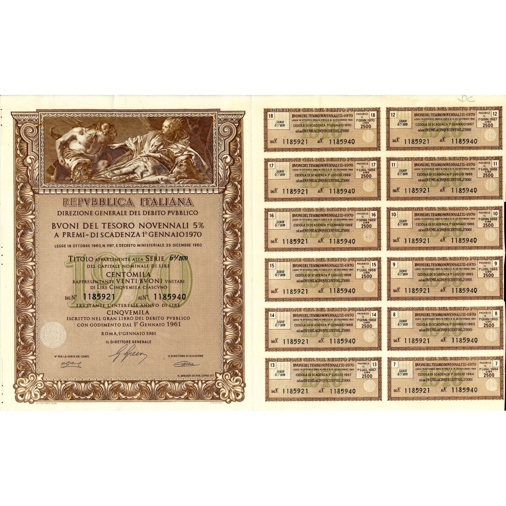 1961 - REPUBBLICA ITALIANA BUONI DEL TESORO NOVENNALI 5% - 100.000 LIRE - ROMA (Nettuno offre doni a Venezia, marrone)