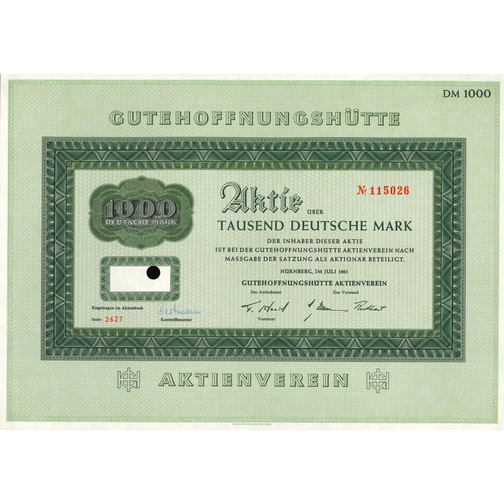 Questo documento della Gutehoffnungshütte Aktienverein è un esempio magnifico di certificato storico. Emesso nel 1961, con un valore nominale di 1.000 Deutsche Mark, esso rappresenta non solo un investimento economico dell'epoca, ma anche un pezzo d'arte con dettagli grafici affascinanti. I firmatari del certificato, insieme al controllore, aggiungono un tocco personale e autentico che rende ogni pezzo unico.