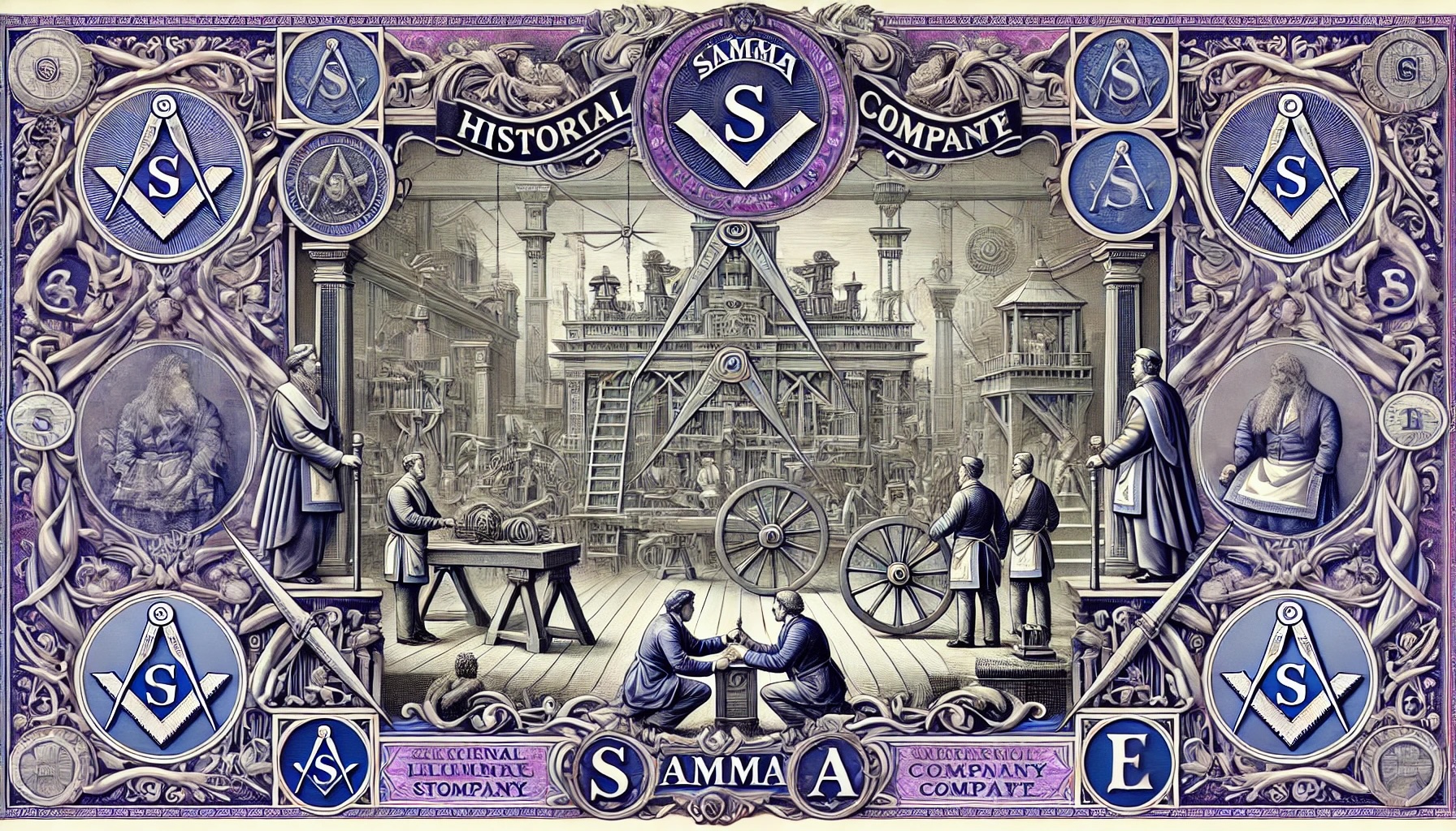 Caratteristiche Visive: Il certificato è decorato con una cornice elaborata in viola e blu. Ai quattro angoli del documento ci sono ritratti di figure storiche. In basso, al centro, un medaglione mostra una scena industriale. Sono presenti vari timbri e firme.