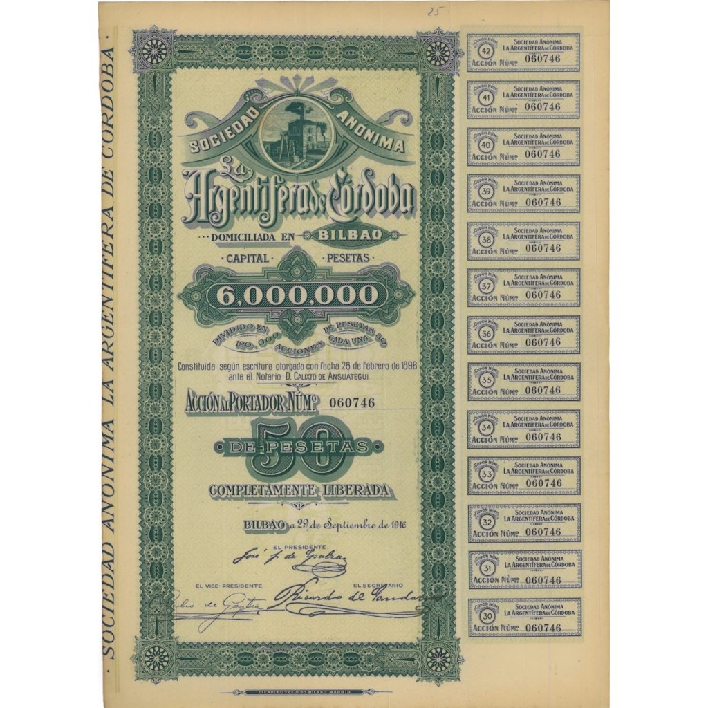 Acción al portador número 092881, por valor de cincuenta pesetas, de la Sociedad Anónima La Argentífera de Córdoba, emitida en Bilbao el 29 de septiembre de 1916.