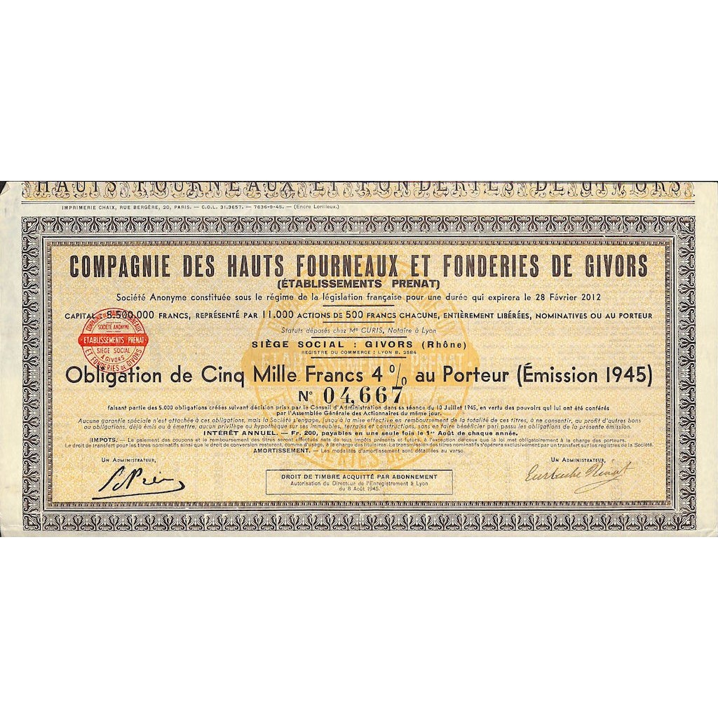 1945 - HAUTS FORNEAUX ET FONDERIES DE GIVORS COMP. DES