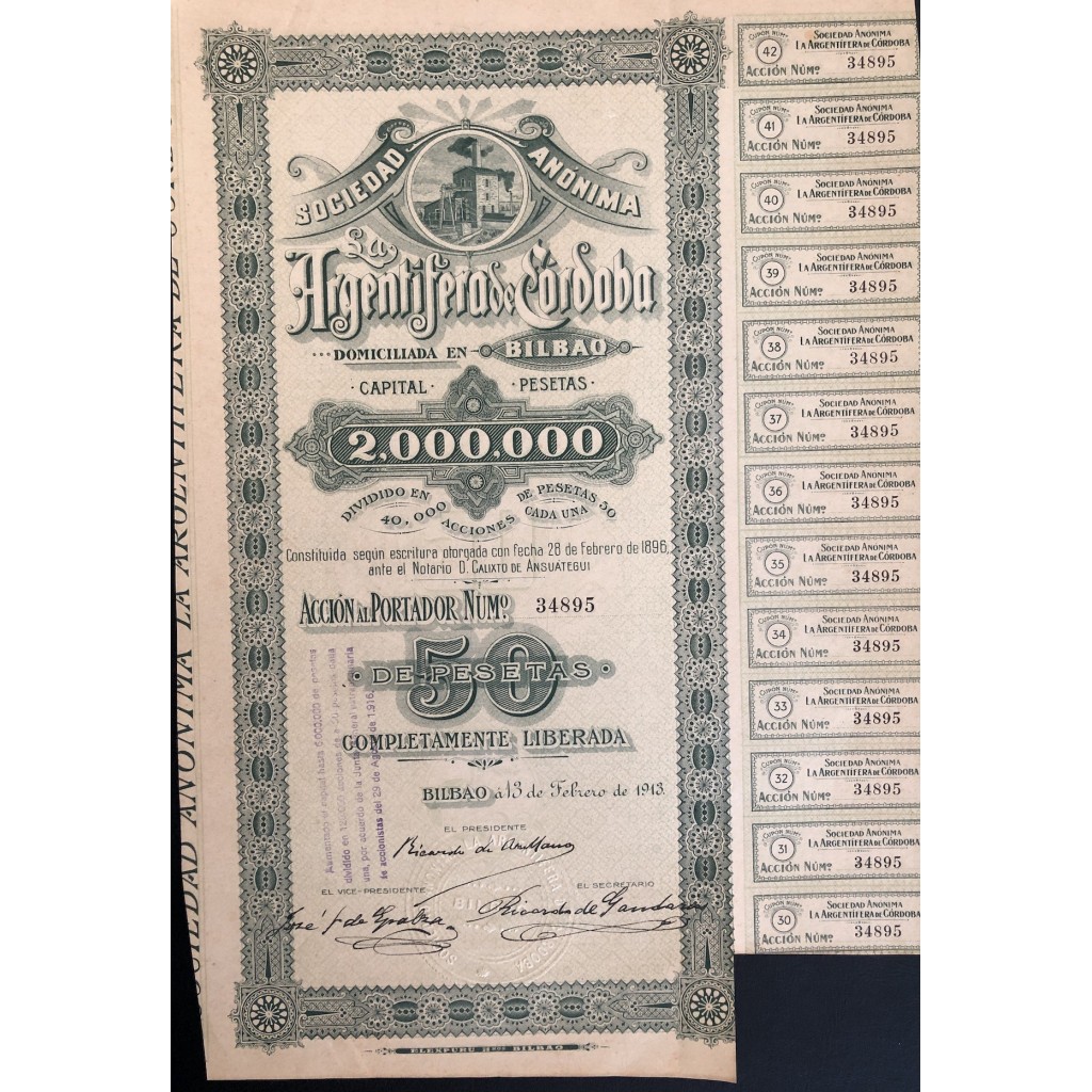 "La Argentífera de Córdoba", domiciliada en Bilbao, quedó constituida como Sociedad Anónima según escritura otorgada con fecha de 28 de febrero de 1896 ante el notario Calixto de Ansuátegui, contando con un capital social de 6.000.000 pesetas, dividido en 120.000 acciones de 50 pesetas cada una.