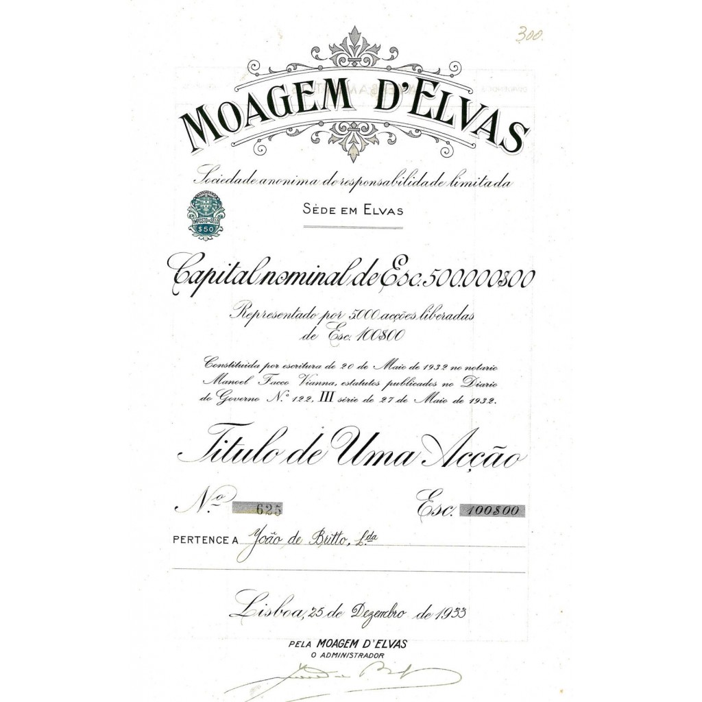 Data e Luogo: Il titolo è stato emesso a Lisbona il 25 Agosto 1933, come attestato dalle firme dei membri dell'amministrazione della Moagem D'Elvas.