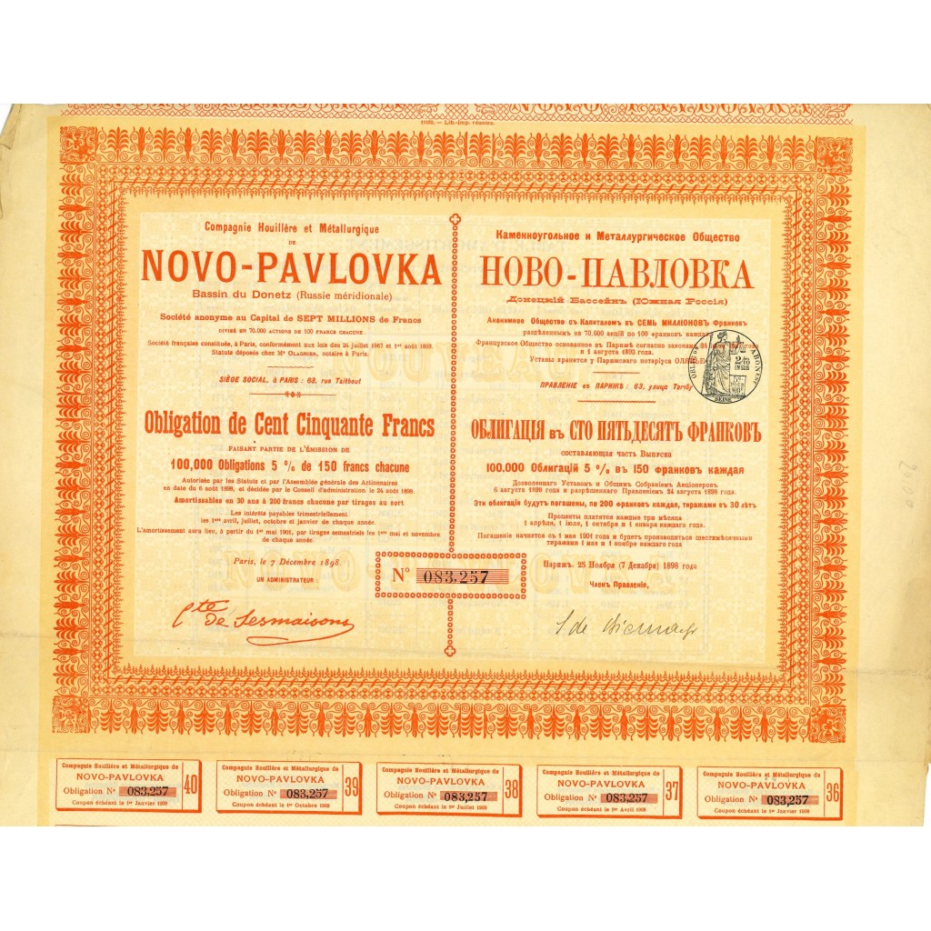 La "Compagnie Houillère et Métallurgique de Novo-Pavlovka" è stata una delle principali società minerarie e metallurgiche attive nel bacino del Donetz, nel sud della Russia. Fondata nel 1898, la società si occupava dell'estrazione e della lavorazione del carbone e di altre risorse minerarie, fondamentali per l'industria dell'epoca. La società ha svolto un ruolo cruciale nello sviluppo economico e industriale della regione, contribuendo significativamente all'economia locale e nazionale.