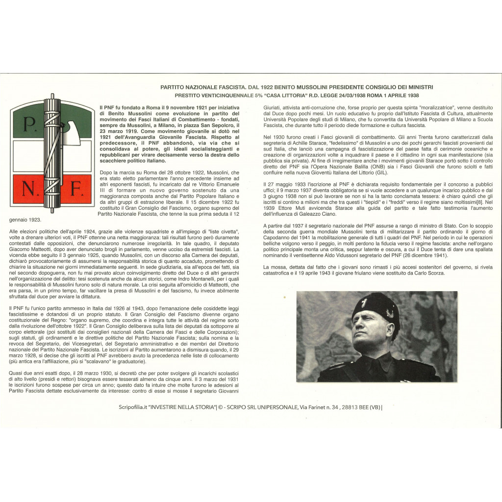 Nato nel 1921 dalla trasformazione in partito del movimento Fasci Italiani di Combattimento, guidò la cosiddetta marcia su Roma che portò, nell'autunno del 1922, Benito Mussolini a divenire presidente del Consiglio dei ministri.